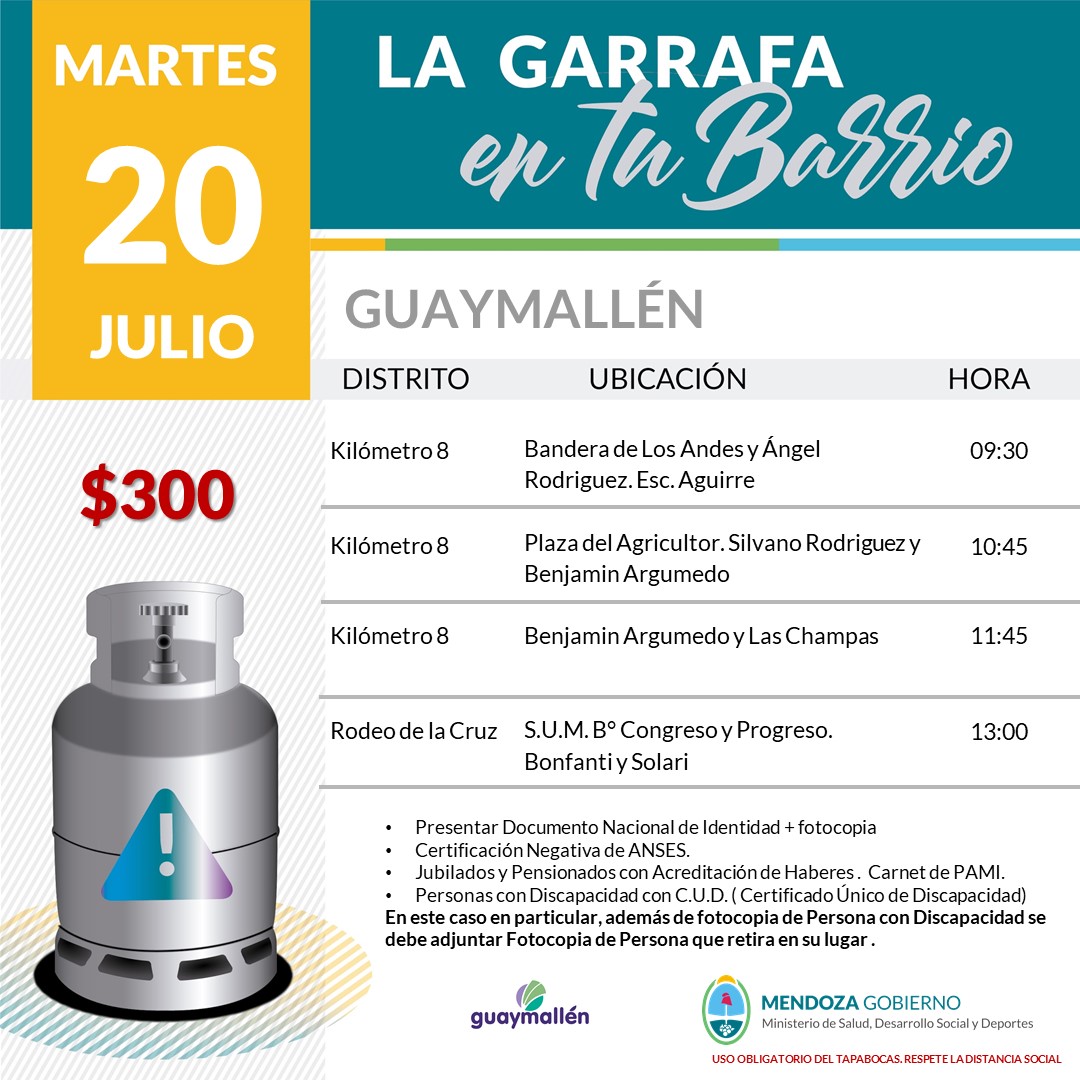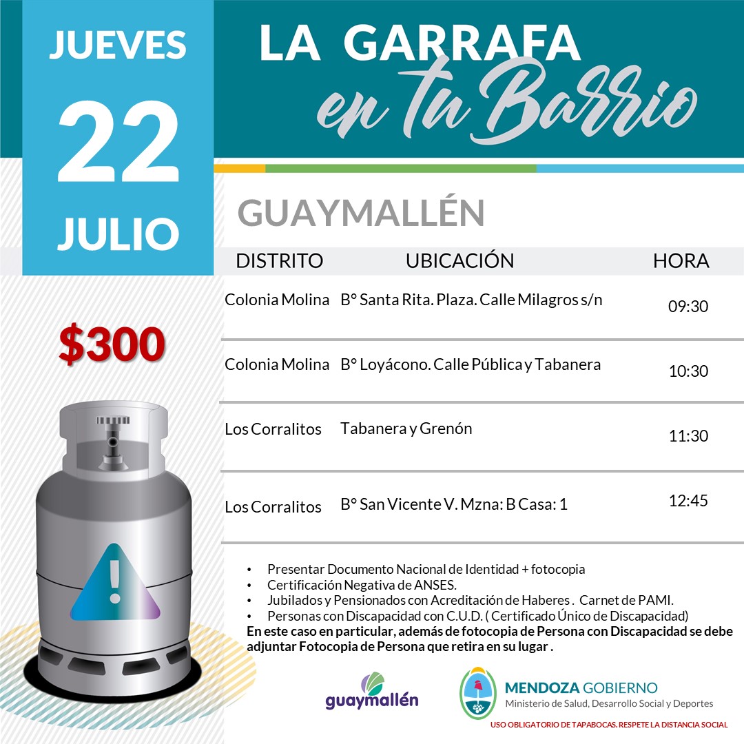 Los días martes 20, miércoles 21 y jueves 22 de julio, los vecinos podrán adquirir hasta dos garrafas a $300, mediante al operativo subsidiado con fondos provinciales, que continuará durante todo el periodo invernal. Para acceder a dicho beneficio deben presentar fotocopia del DNI y Certificación Negativa de ANSES. Este programa también incluye a jubilados, pensionados y personas con discapacidad que acrediten su condición con carnet y/o CUD (certificado único de discapacidad).
