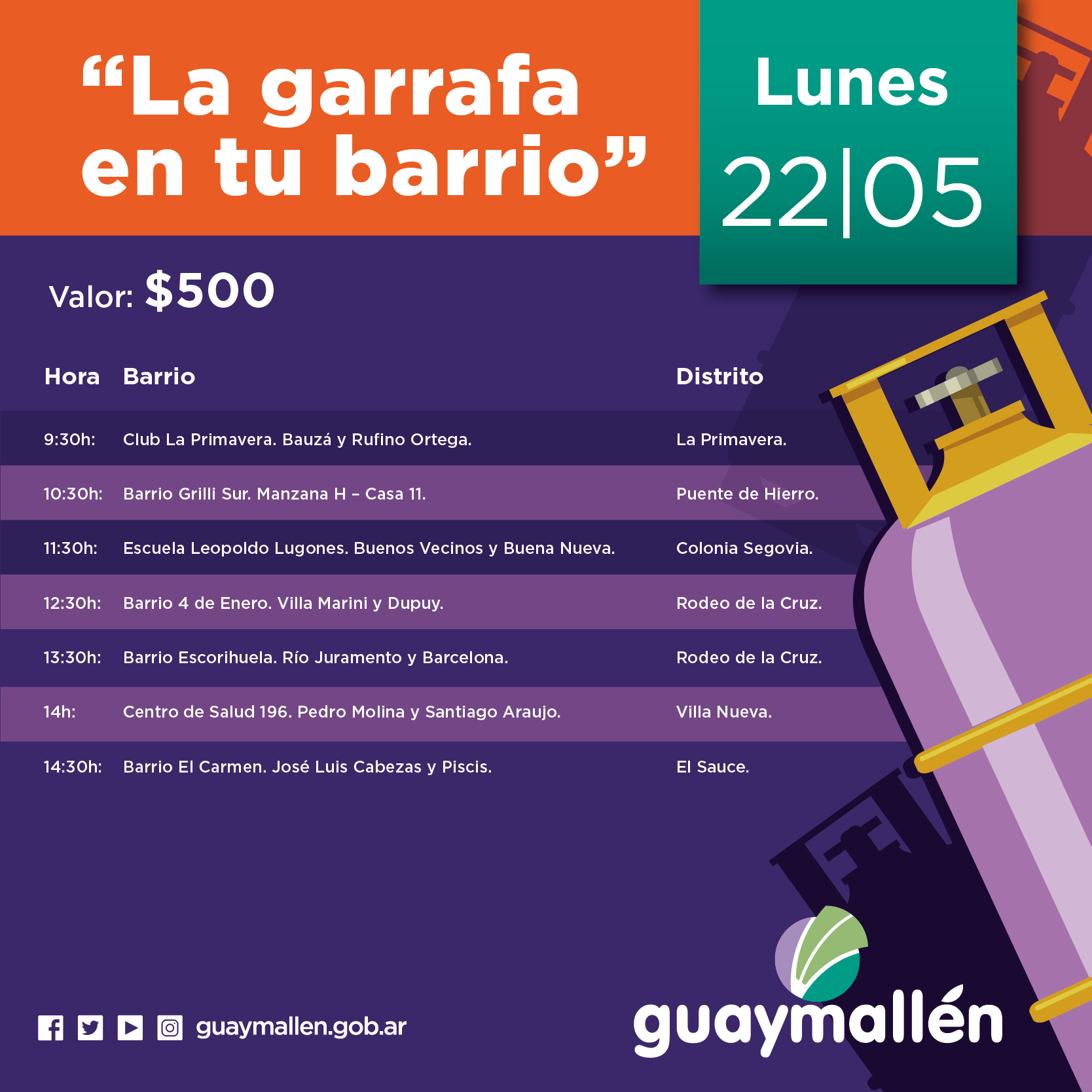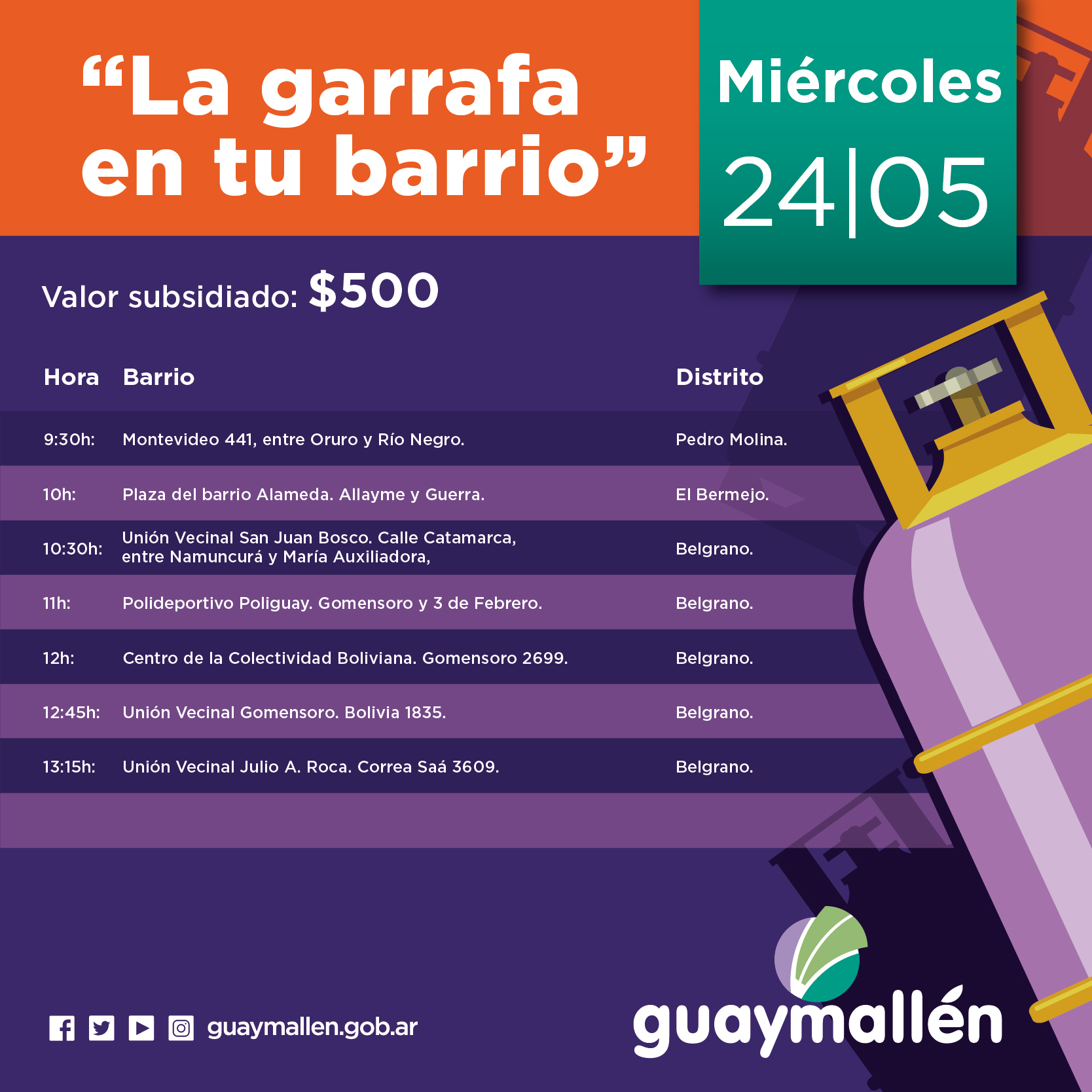 La próxima semana, los vecinos del departamento podrán adquirir hasta dos recargas de garrafas de 10 kg a $500 cada una, gracias al subsidio municipal. Para acceder a dicho beneficio, deben presentar fotocopia del DNI y Certificación Negativa de ANSES. Las personas jubiladas o pensionadas tienen que llevar fotocopia del carnet de PAMI y/o de jubilado/a; mientras que las personas con discapacidad deben llevar fotocopia del CUD (certificado único de discapacidad).