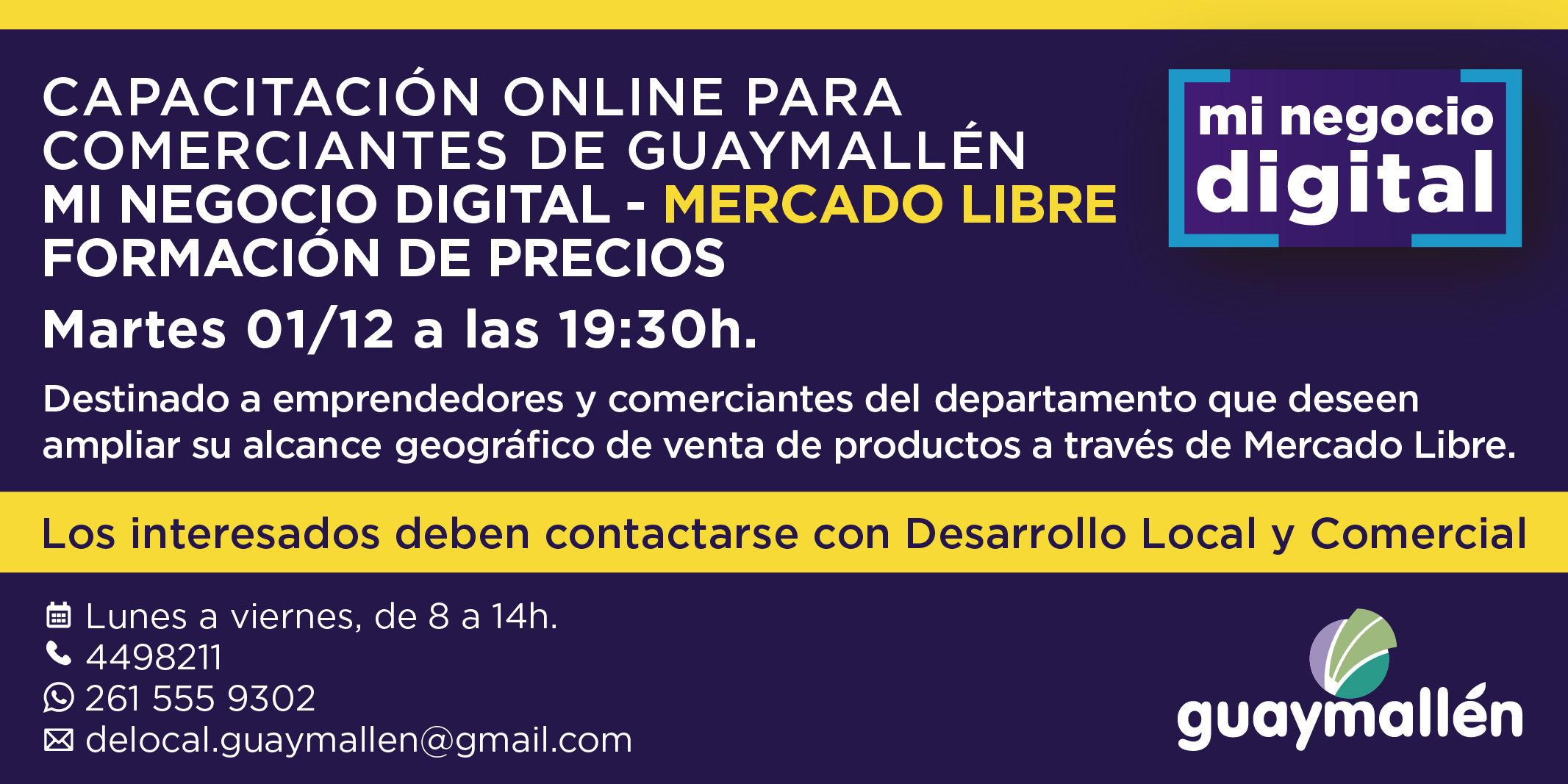 El municipio invita a emprendedores y comerciantes de Guaymallén a seguir aprendiendo sobre una herramienta relevante del mundo digital: Mercado Libre. La capacitación virtual se realizará el martes 1 de diciembre, a las 19:30h, y abordará temas referidos a formación de precios adecuados para este canal.