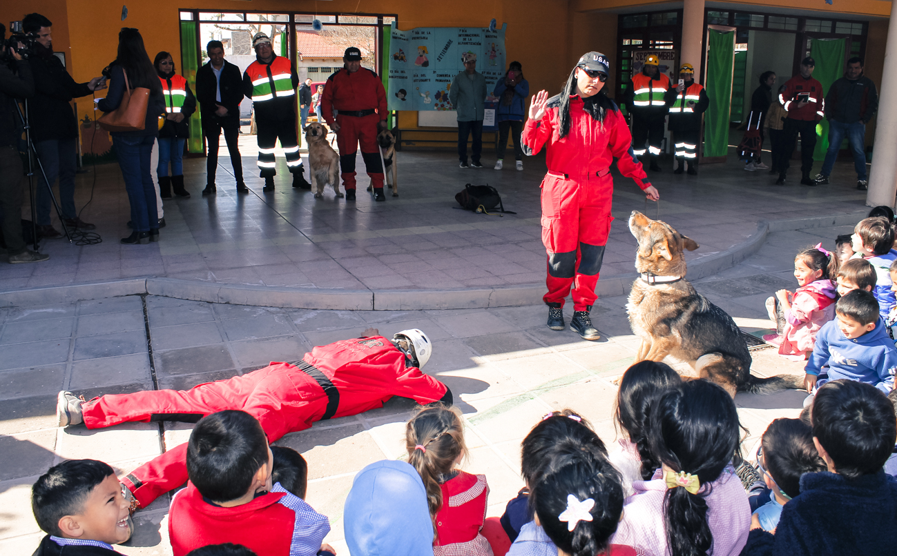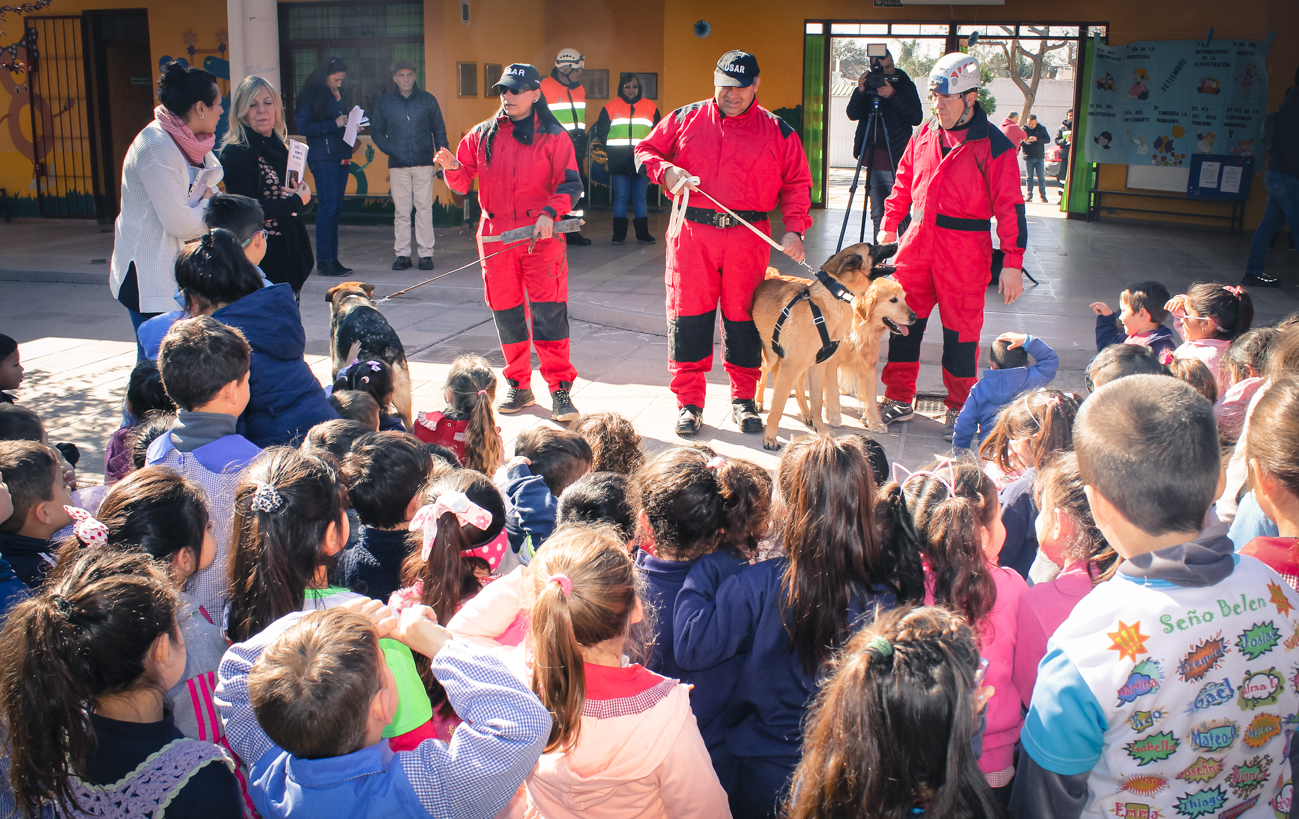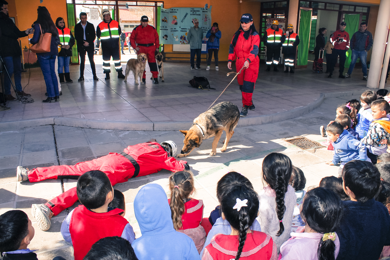 Los niños participaron activamente del simulacro que tuvo como protagonistas a los canes transformados en verdaderos héroes de cuatro patas, preparados para labores de búsqueda de desaparecidos en incendios, derrumbamientos u otras catástrofes. Son perros que poseen características especiales en cuanto a: peso, altura, destreza y rapidez, unidas al desarrollo de sus sentidos.