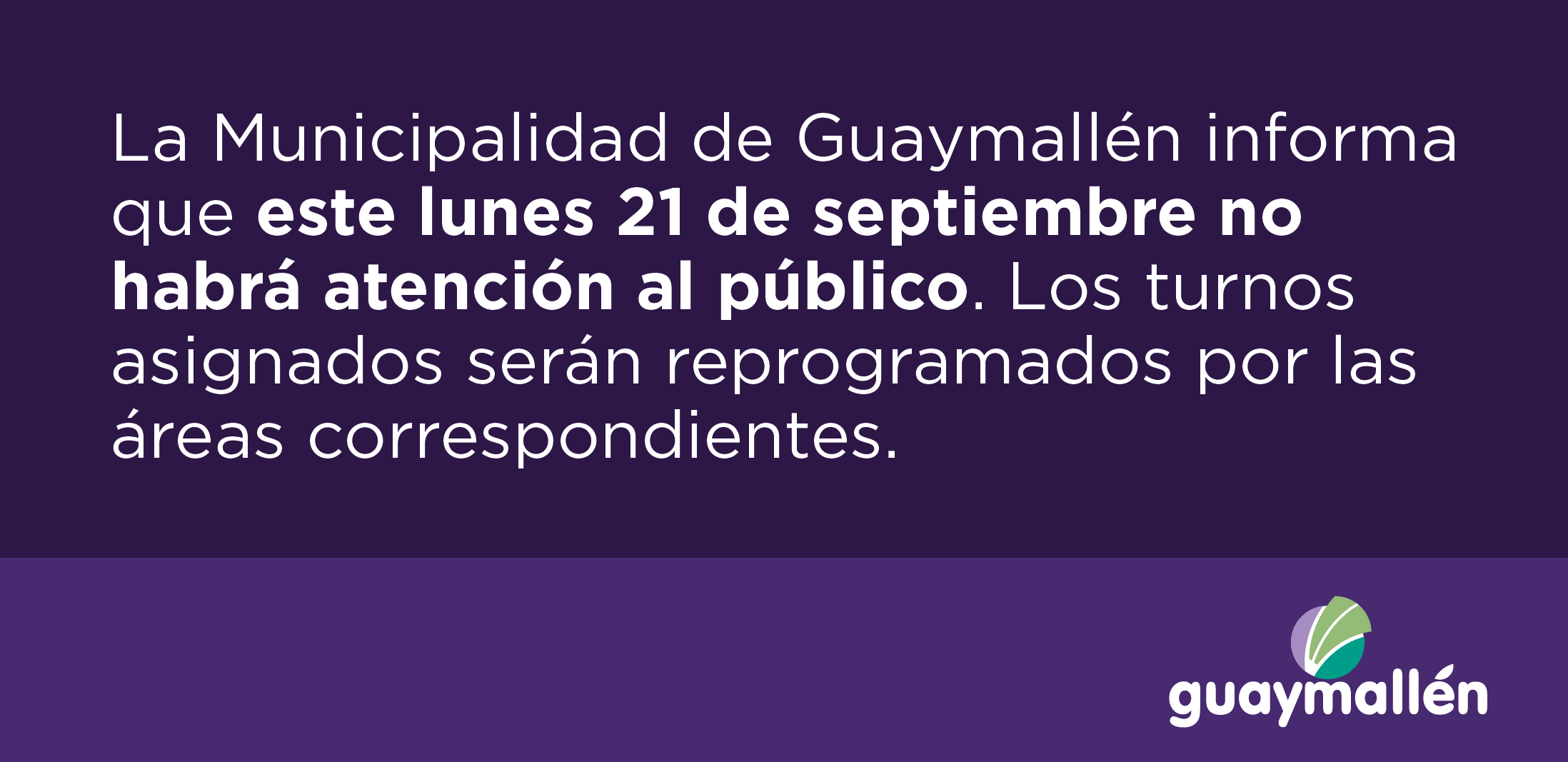 La Municipalidad de Guaymallén informa que este lunes 21 de septiembre no habrá atención al público. Los turnos asignados serán reprogramados por las áreas correspondientes.