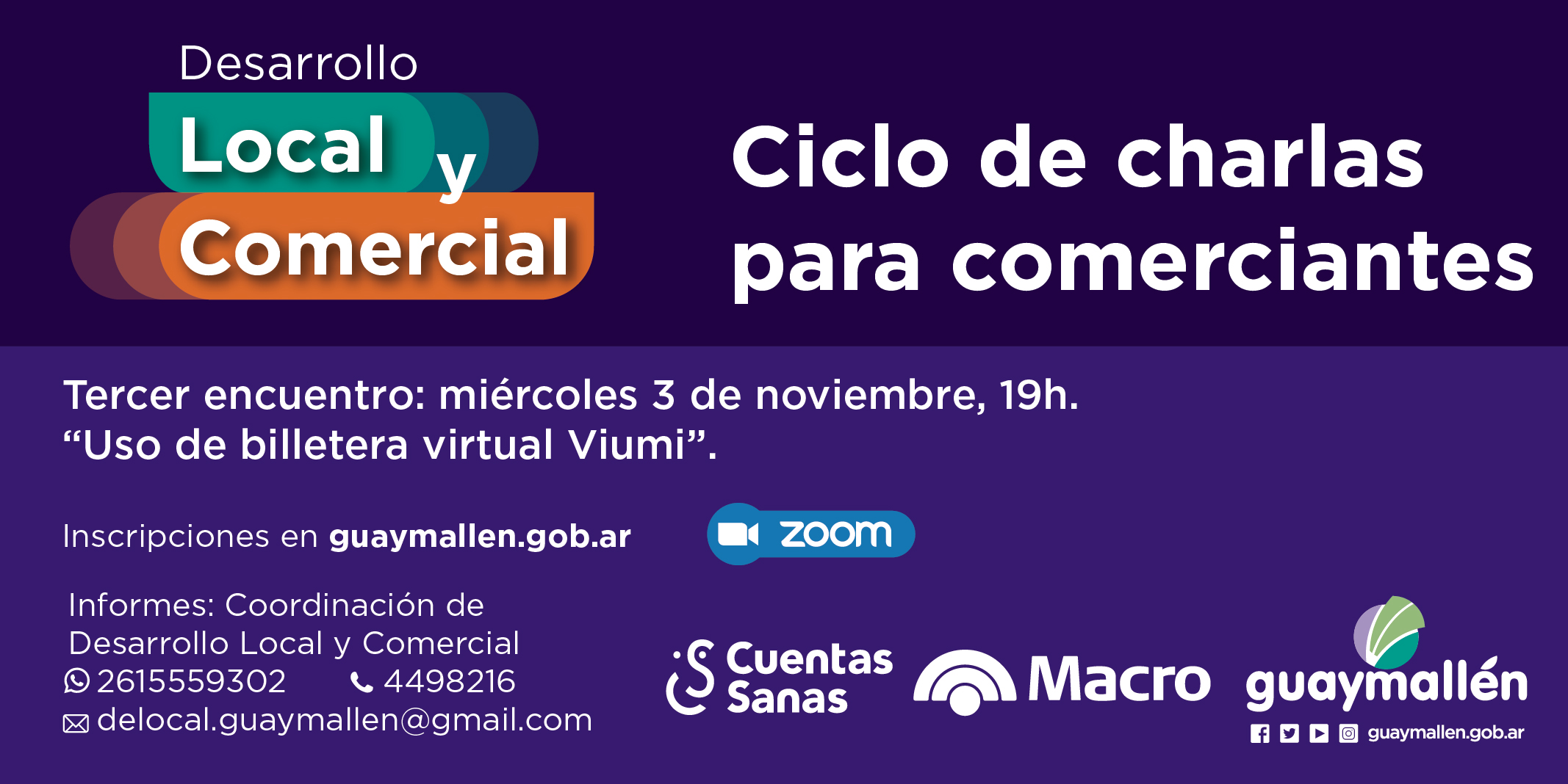 Este miércoles 3 de noviembre, a las 19h, se llevará a cabo el tercer encuentro del Ciclo de charlas para comerciantes del departamento. La iniciativa se realiza en conjunto con el Banco Macro y quienes deseen formar parte deben inscribirse en https://bit.ly/3AOobrr. La capacitación tendrá como eje el uso de la billetera virtual Viumi y será a través de la plataforma digital Zoom.