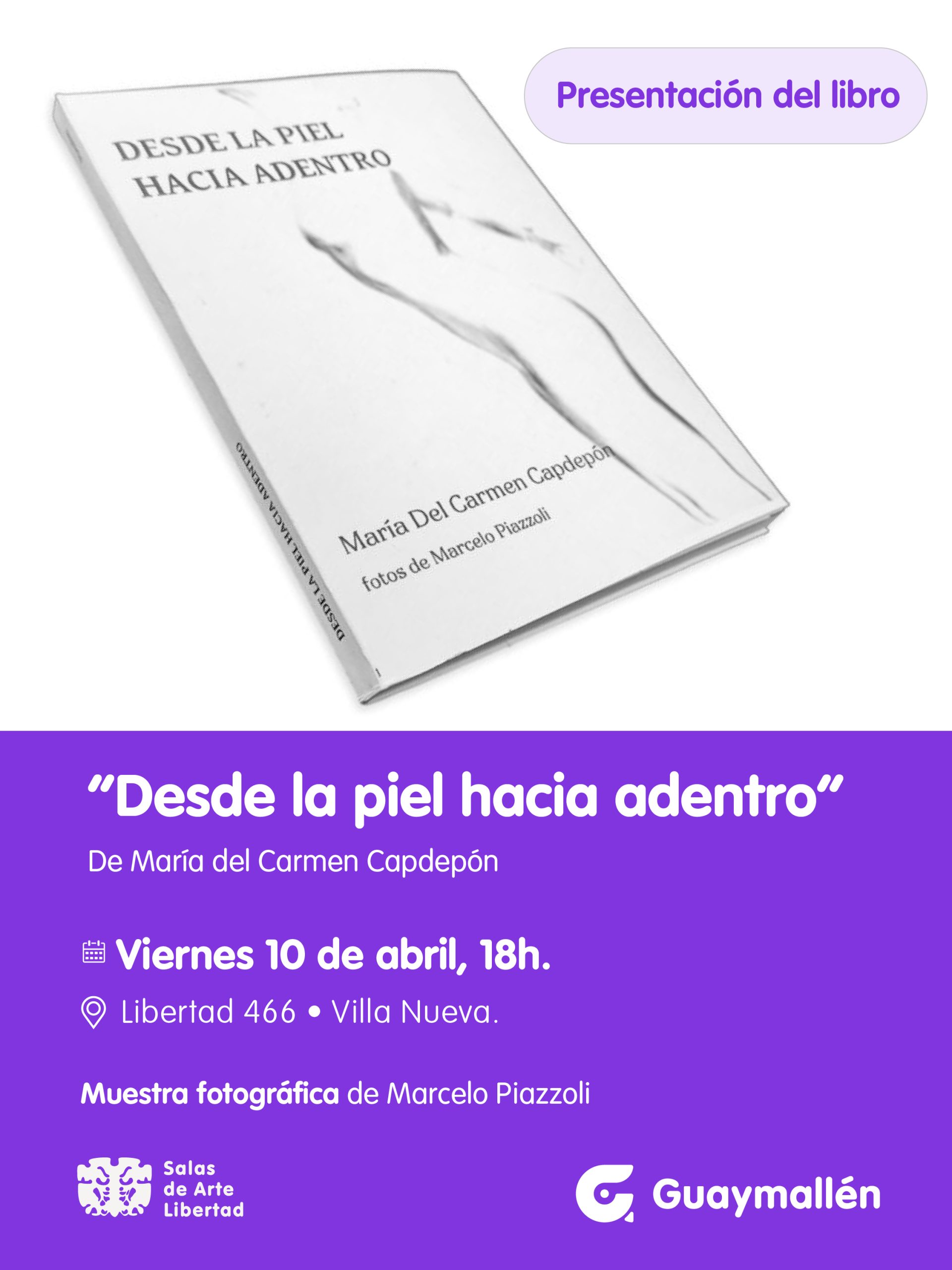 La Municipalidad de Guaymallén invita a vecinos y visitantes a la presentación del libro “Desde la piel hacia adentro”, de la escritora María del Carmen Capdepón, que tendrá lugar el próximo viernes 10 de abril, a las 18h, en las Salas de Arte Libertad (Libertad 466, Villa Nueva). La actividad contará con entrada gratuita y cupos limitados debido a la capacidad del lugar, por lo que se recomienda asistir puntual.
