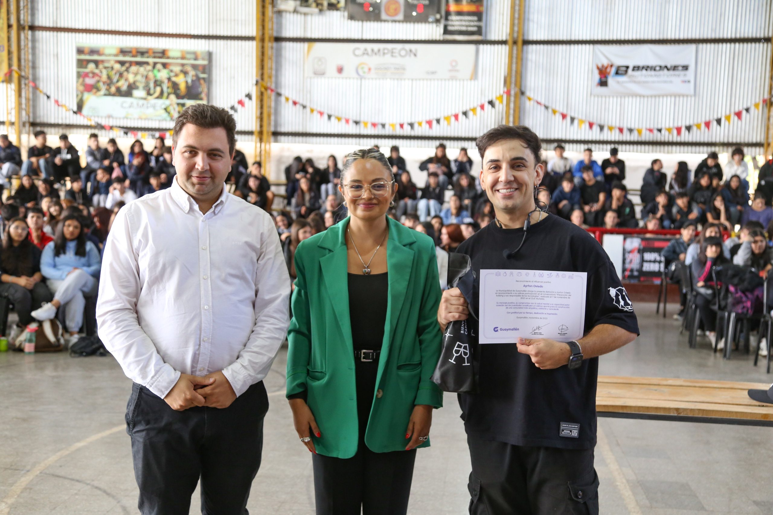 Al cierre de la presentación , el secretario de Gobierno de la Municipalidad de Guaymallén, Ignacio Conte, y la coordinadora de Juventudes, Sofía Maturano, entregaron un reconocimiento institucional a Ayrton Oviedo.