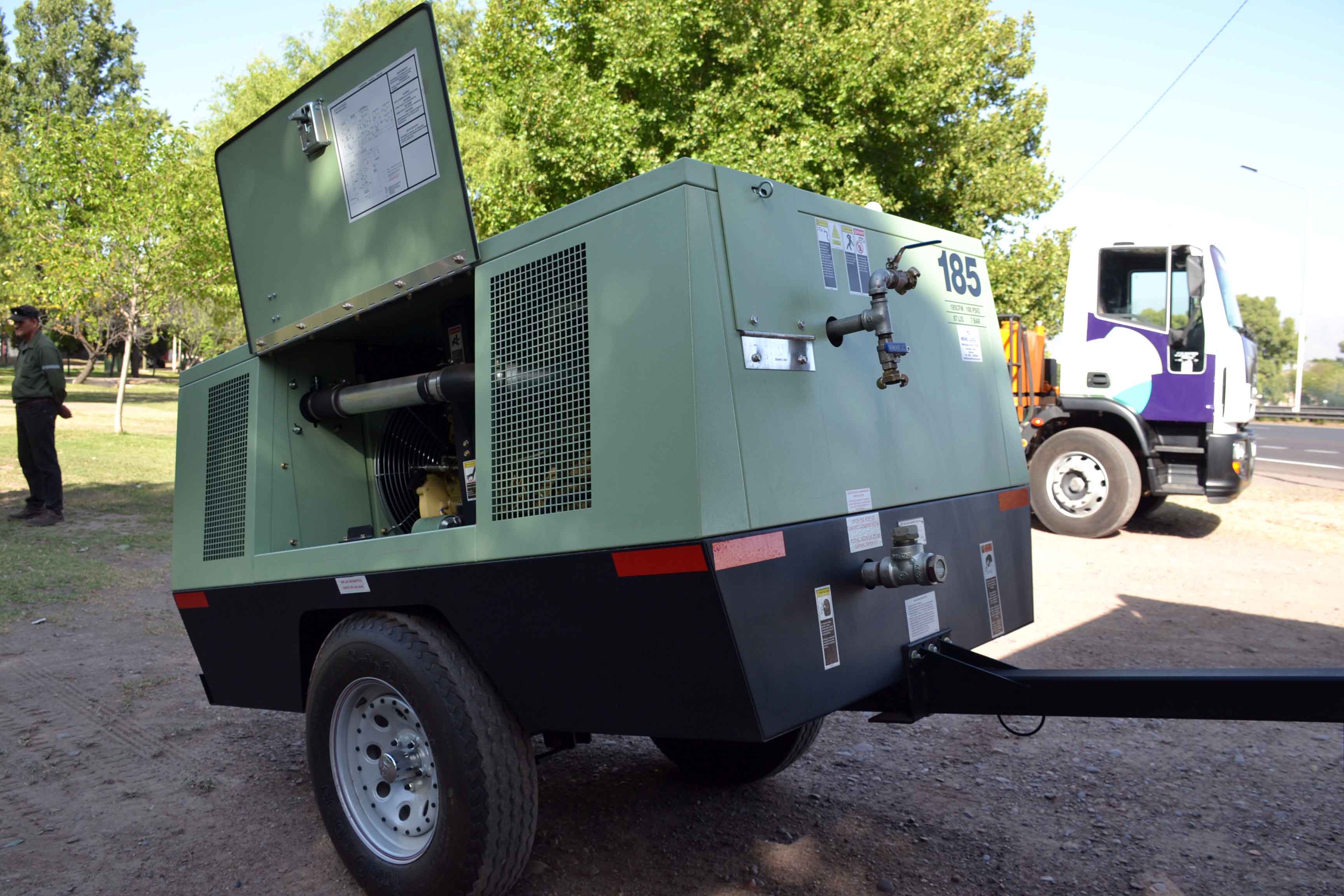 Por último, la presentación incluyó el nuevo motocompresor de aire, cuyo sistema permite desobturar las alcantarillas, a fin de resolver taponamientos y permitir el correcto drenaje de las aguas. Este equipo consta de una cabina metálica con chasis sobre eje de dos ruedas, lanza articulada con regulación de altura y sistema de suspensión a elásticos, más dispositivo de seguridad por desenganche del compresor y luces reglamentarias. Tiene un caudal de 5 m3, con una presión de trabajo a 7 Kg/cm2, y un motor diesel de cuatro cilindros. Posee un sistema rotativo a tornillo helicoidal de perfil asimétrico, un completo tablero de instrumento para controlar su operatividad y un martillo rompe pavimento de 36 kg con punta hexagonal, que logra 1.000 golpes por minuto.