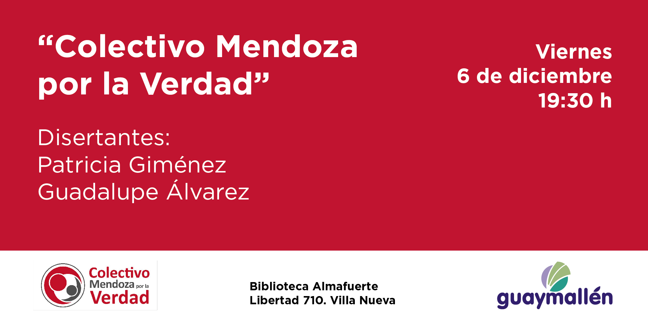 La Municipalidad de Guaymallén invita a un nuevo encuentro del Colectivo Mendoza por la Verdad, en el que disertarán Patricia Giménez y la doctora Guadalupe Álvarez. El mismo se llevará a cabo el viernes 6 de diciembre, a las 19:30, en la biblioteca municipal Almafuerte.