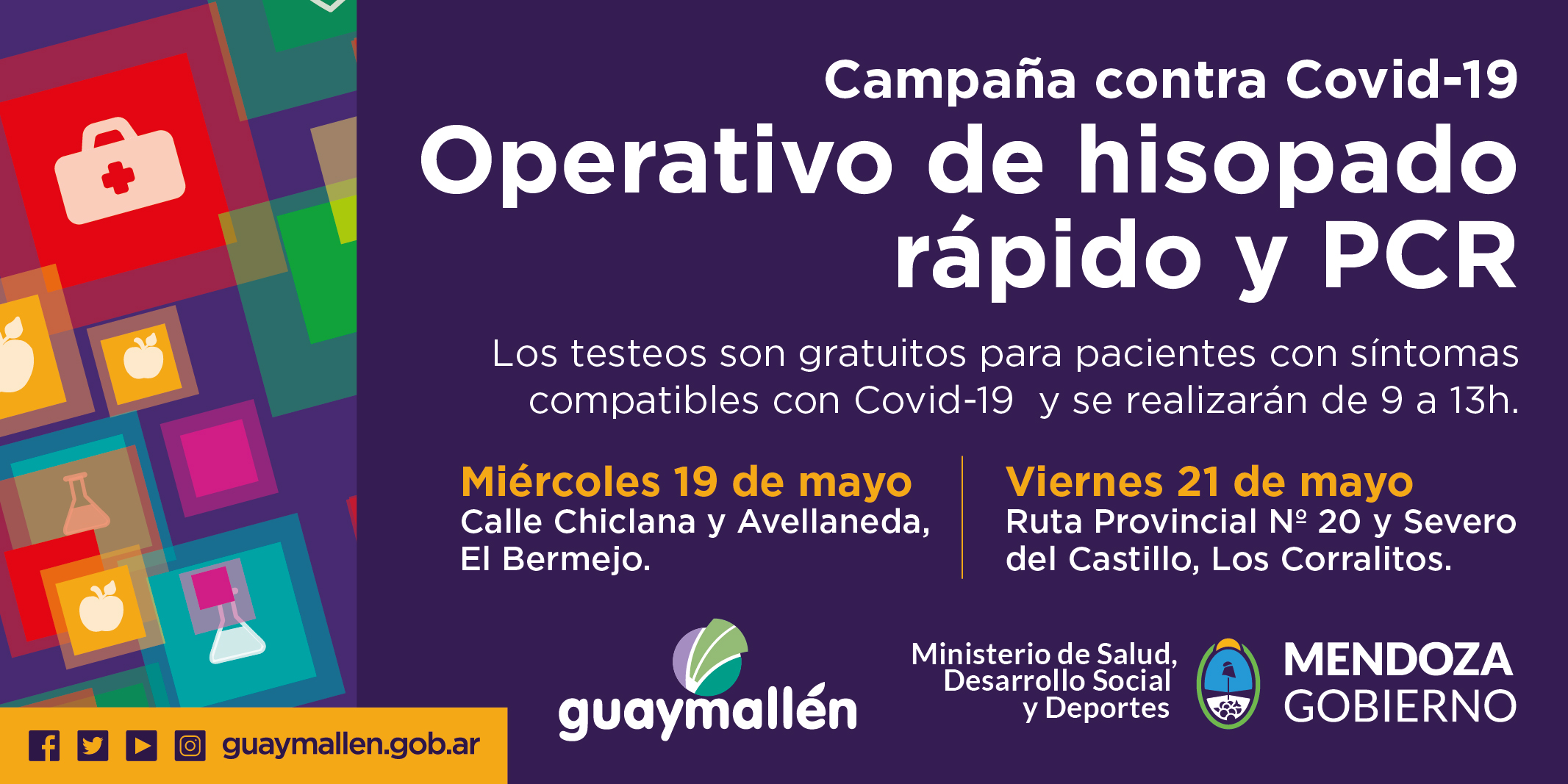 Los días miércoles 19 y viernes 21 de mayo, el Departamento de Epidemiología del Ministerio de Salud, Desarrollo Social y Deportes de la Provincia hará hisopados rápidos y PCR para detección de Covid-19. Es importante aclarar que se realizarán a los vecinos del departamento que lleven 24 o más horas con síntomas compatibles con la enfermedad, entre ellos: fiebre, tos seca, cansancio, dolor de garganta, de cuerpo y/o cabeza, diarrea, pérdida de olfato, pérdida de gusto, dificultad para respirar o sensación de falta de aire, conjuntivitis y erupciones cutáneas.