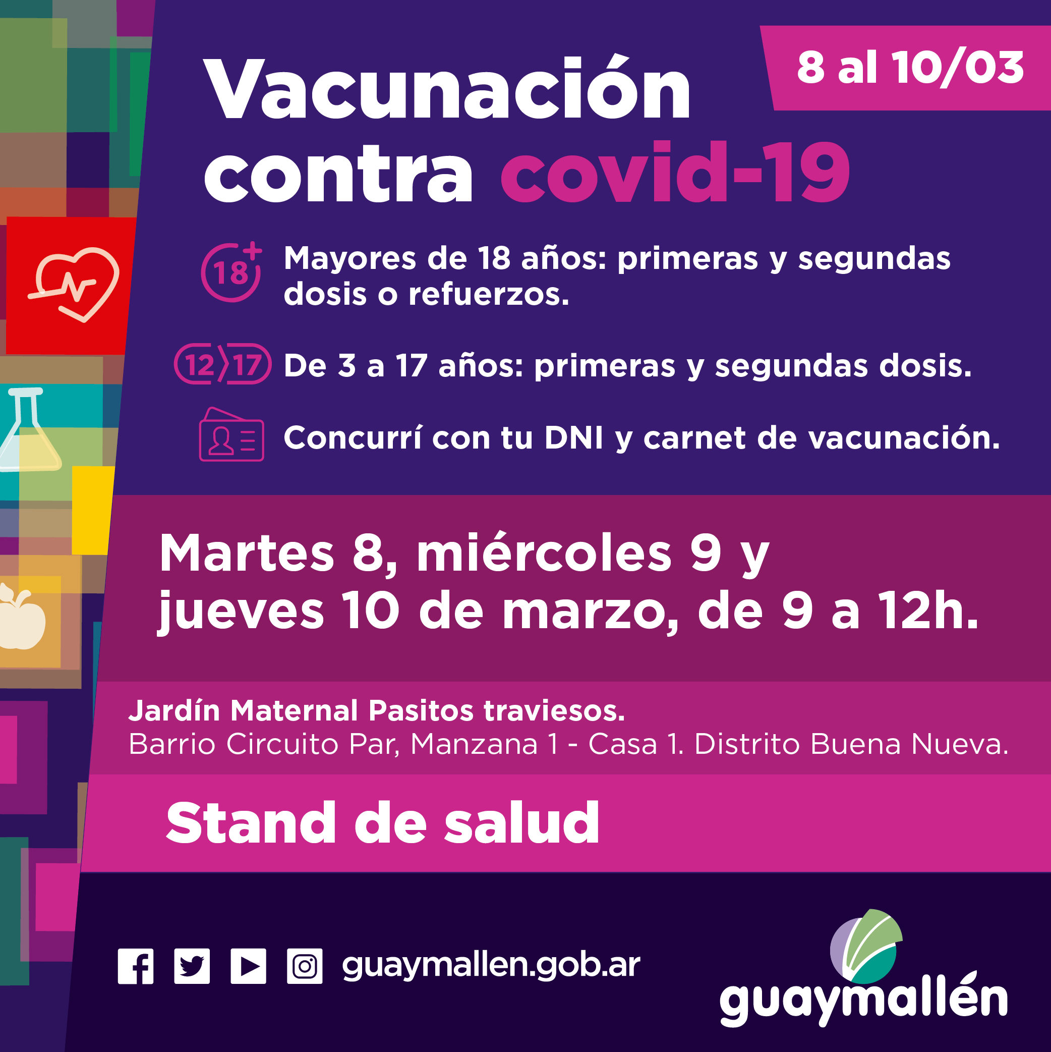 A partir de mañana, martes 8 de marzo, el dispositivo municipal realizará operativos territoriales para que los vecinos puedan iniciar o completar el esquema de vacunación Covid. Los interesados deberán presentar carnet de vacunación o Apps “Mi Argentina y/o “Cuidar” y DNI.