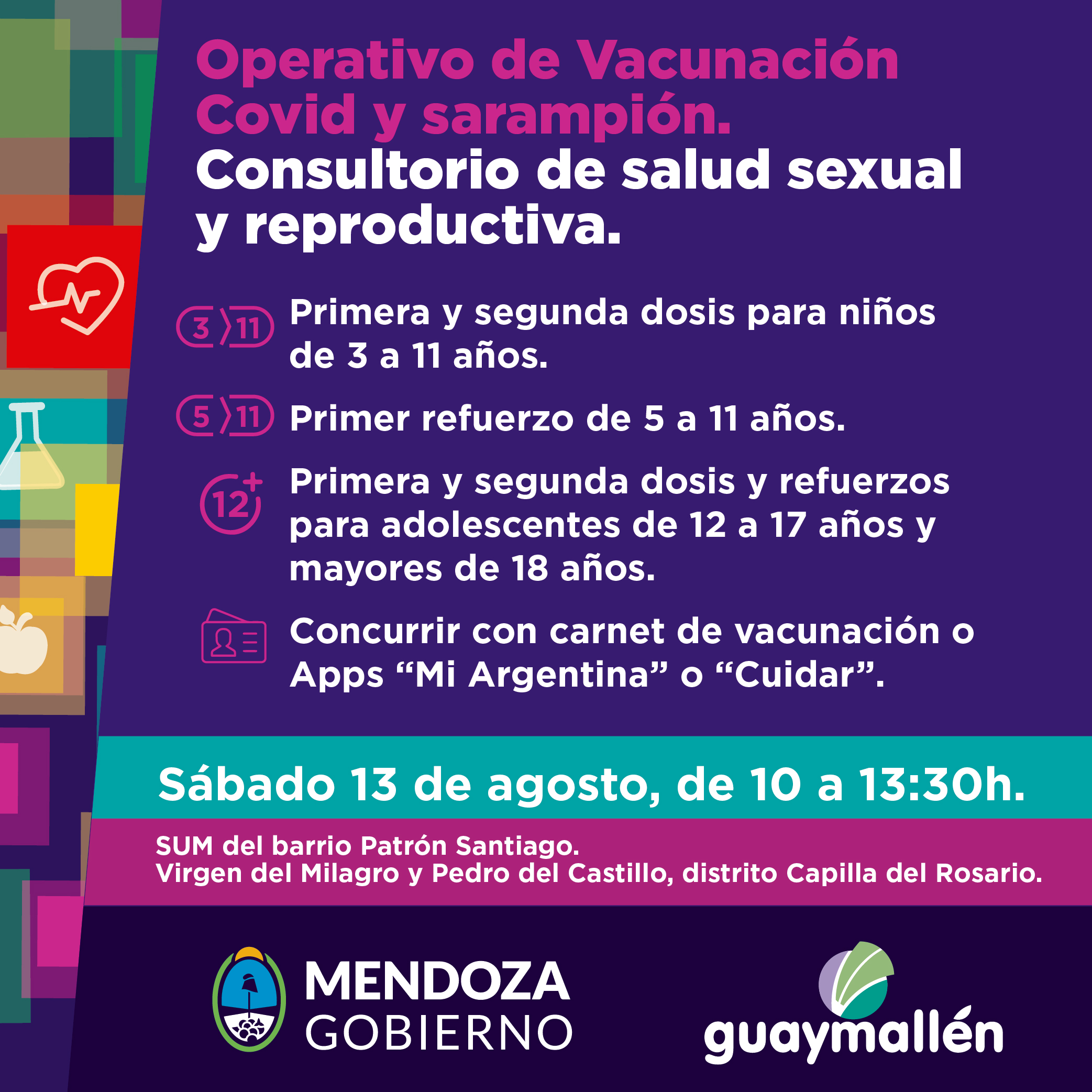 *Sábado 13 de agosto, de 10 a 13.30h: SUM del barrio Patrón Santiago (Virgen del Milagro y Pedro del Castillo, distrito Capilla del Rosario).