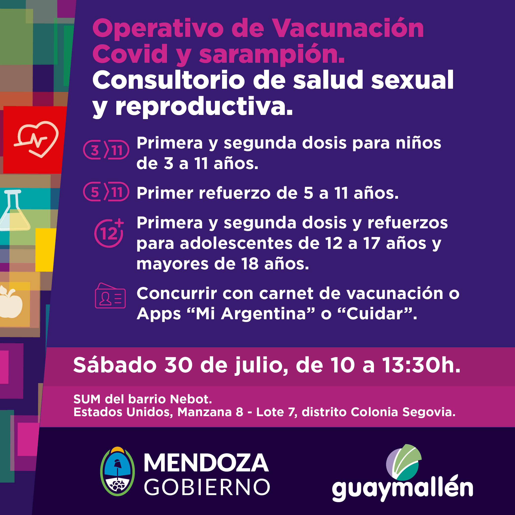 *Sábado 30 de julio, de 10 a 13:30h: SUM del barrio Nebot (Estados Unidos, Manzana 8 – Lote 7, distrito Colonia Segovia).