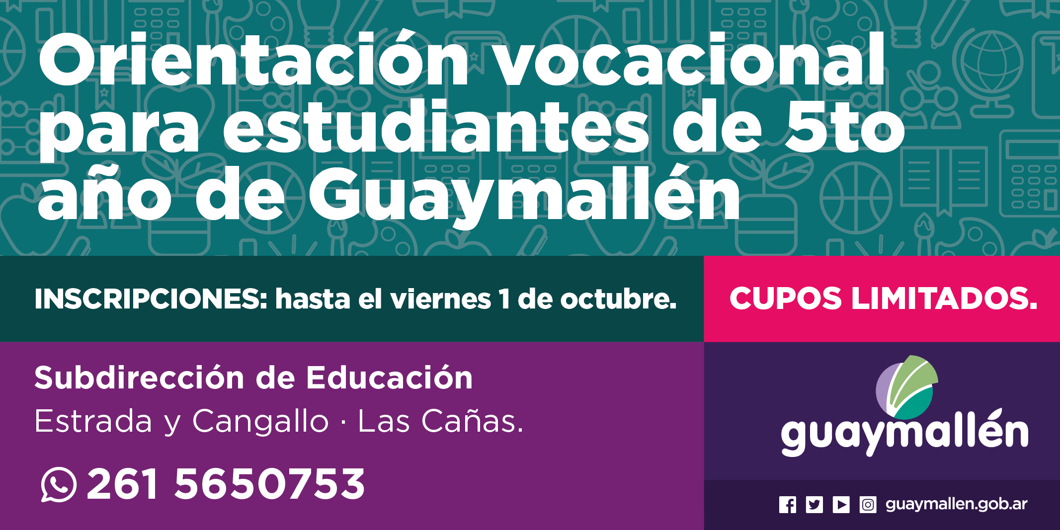 Desde hoy, lunes 27 de septiembre, y hasta el viernes 1 de octubre, el municipio convoca a los estudiantes de 5to año del departamento que estén en proceso de elección de carreras. El objetivo es orientarlos vocacionalmente, brindándoles las herramientas necesarias y generando un espacio de escucha y contención que favorezca la disminución de ansiedades y temores, el autoconocimiento y el descubrimiento de las propias aptitudes, gustos e intereses.