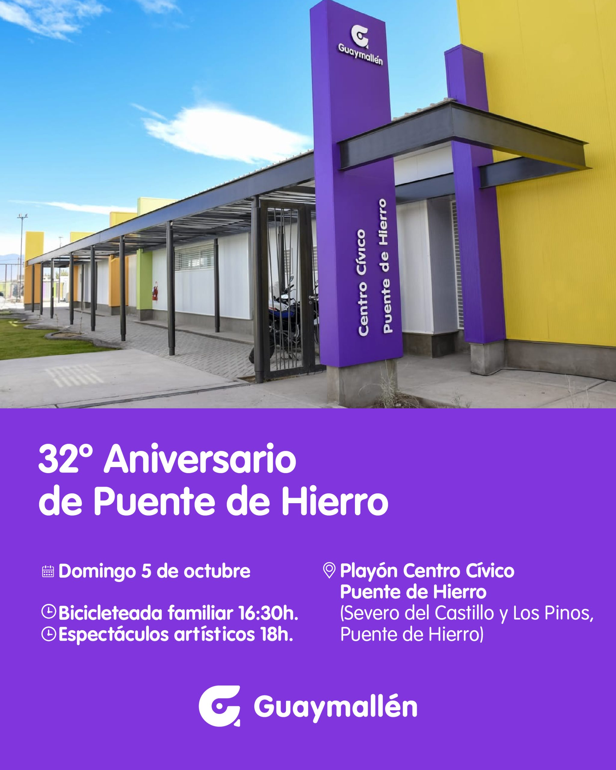 La Municipalidad de Guaymallén invita a la celebración por el 32º aniversario de la creación de Puente de Hierro como distrito. El evento se realizará el domingo 5 de octubre, a partir de las 16.30h, con propuestas gratuitas que incluyen bicicleteada, paseo de artesanos, shows artísticos y un homenaje a vecinos que desarrollan una labor comunitaria destacada. El encuentro será en el Centro Cívico de Puente de Hierro, ubicado en las calles Severo del Castillo y Los Pinos.
