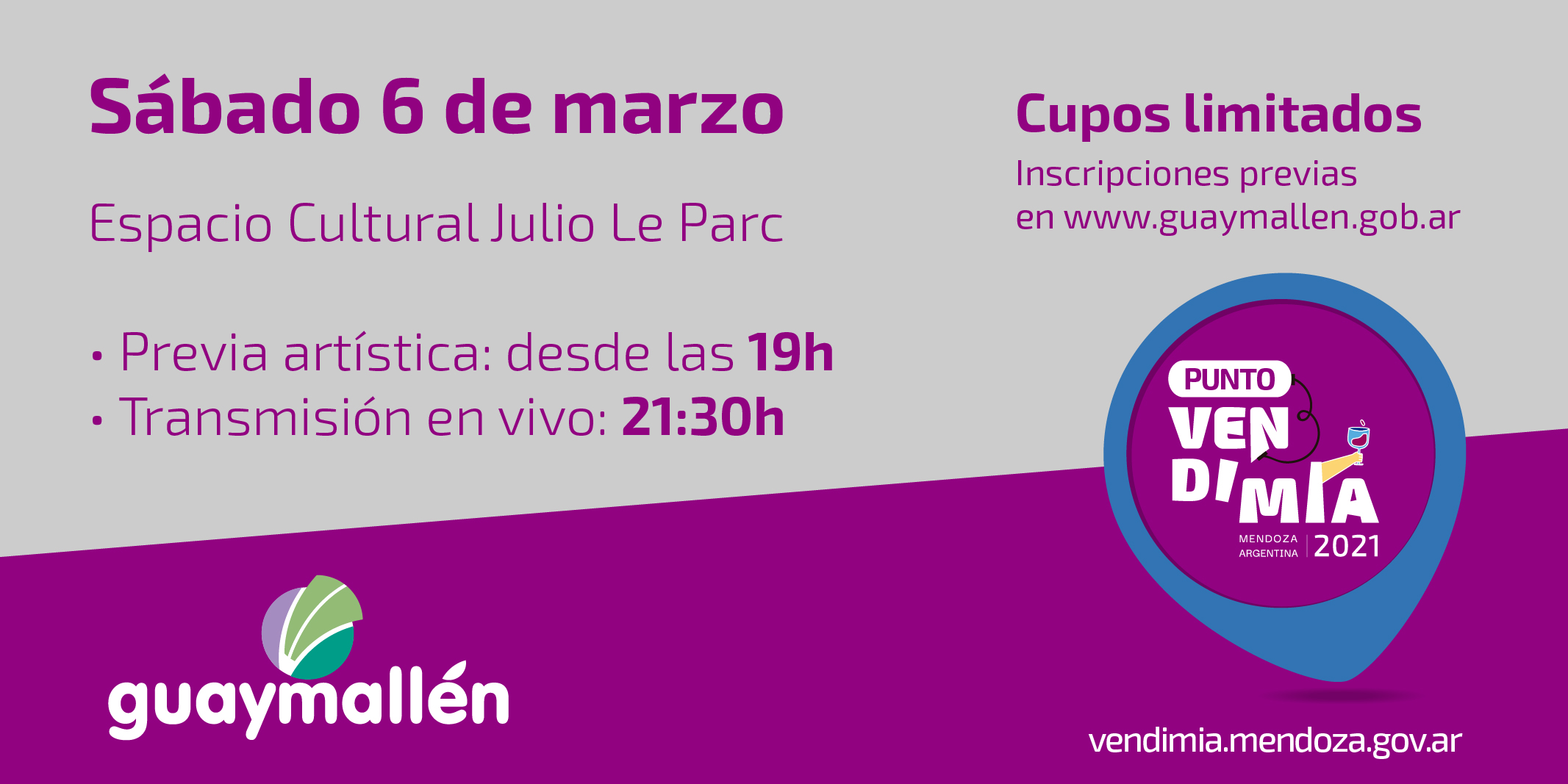 En el caso de Guaymallén, el lugar elegido es el Espacio Cultural Julio Le Parc. Los interesados podrán asistir de forma gratuita y está permitido hasta tres acompañantes por persona. Es decir que, con un mismo DNI, podrán registrar como máximo cuatro entradas. Para ello, deben completar el formulario disponible en https://docs.google.com/forms/d/e/1FAIpQLSfqvHTv4YiixaQj1C6SUBBgXoj9TwVDDyd6CHZuKVX_aNNsow/viewform?usp=sf_link. Una vez realizado este paso, a partir del miércoles 3 de marzo se comunicarán con los inscriptos para confirmar asistencia. Vale mencionar que solo quedan 200 cupos disponibles.