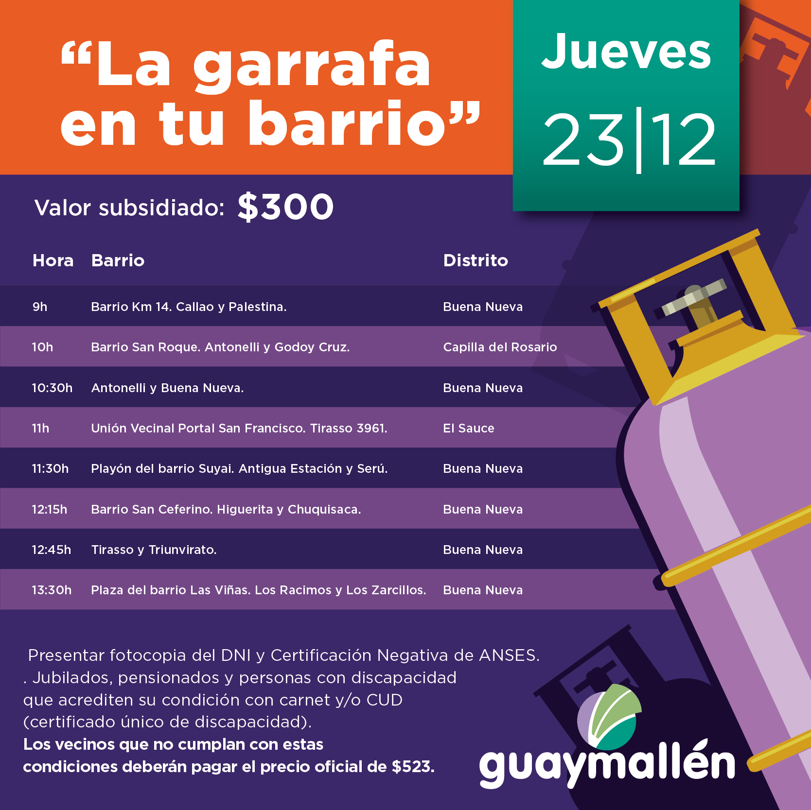 Los días 20, 21, 22 y 23 de diciembre, los vecinos podrán adquirir hasta dos garrafas de 10 kg. a $300 cada una, a partir de un subsidio municipal. Para obtener dicho beneficio, tendrán que presentar fotocopia del DNI y Certificación Negativa de ANSES. Esta iniciativa también tiene en cuenta a jubilados, pensionados y personas con discapacidad que acrediten su condición con carnet y/o CUD (certificado único de discapacidad).