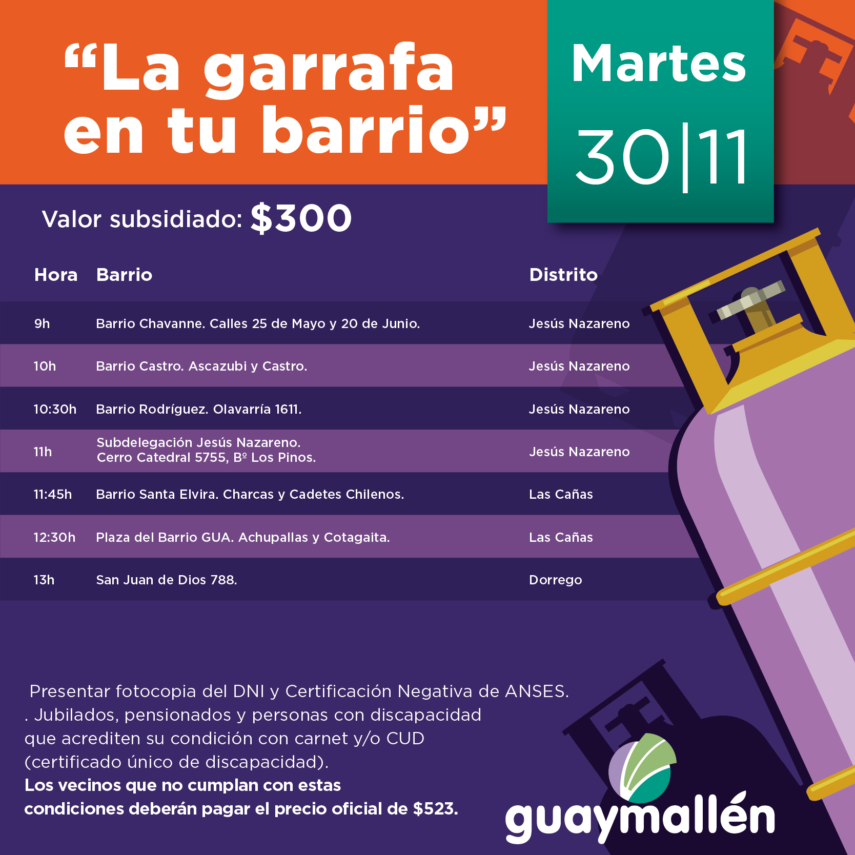 La próxima semana, los vecinos podrán adquirir hasta dos garrafas de 10 kg. a $300 cada una, mediante un subsidio municipal. Para acceder a dicho beneficio, tendrán que presentar fotocopia del DNI y Certificación Negativa de ANSES. Esta iniciativa también incluye a jubilados, pensionados y personas con discapacidad que acrediten su condición con carnet y/o CUD (certificado único de discapacidad).