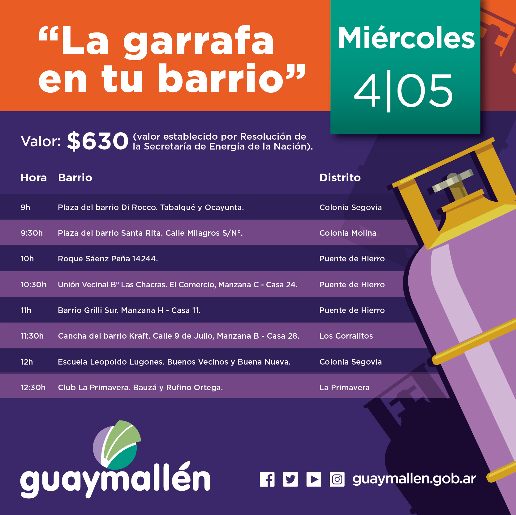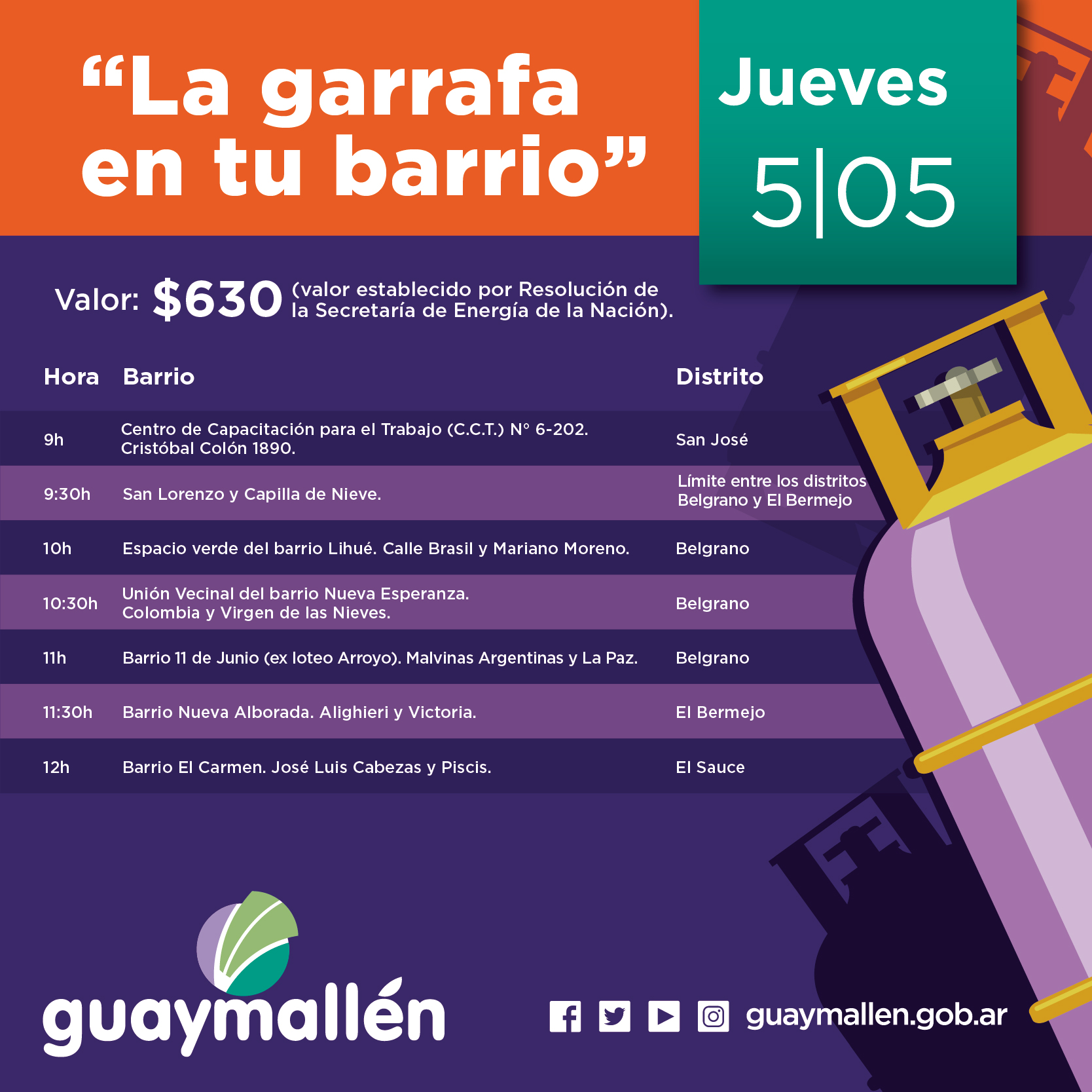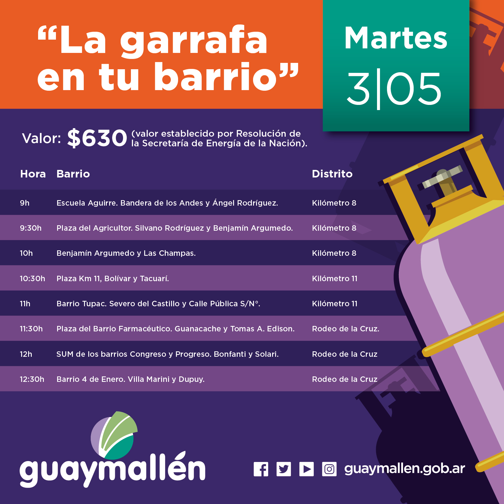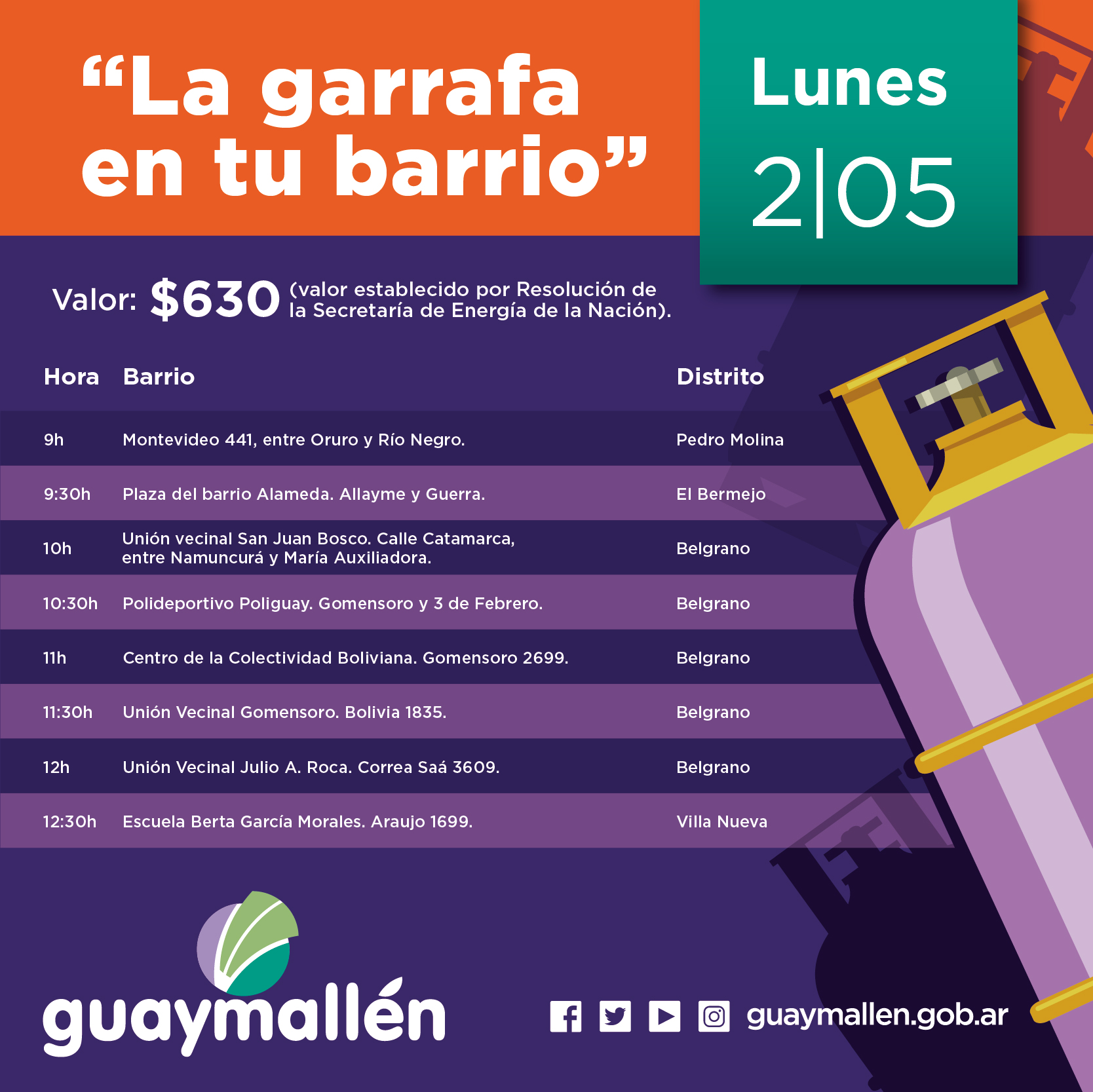 La próxima semana se realizará la venta directa de gas envasado en diversos puntos de Guaymallén. Los vecinos podrán comprar garrafas de 10 kg. al precio oficial actualizado de $630 (valor establecido por Resolución de la Secretaría de Energía de la Nación).