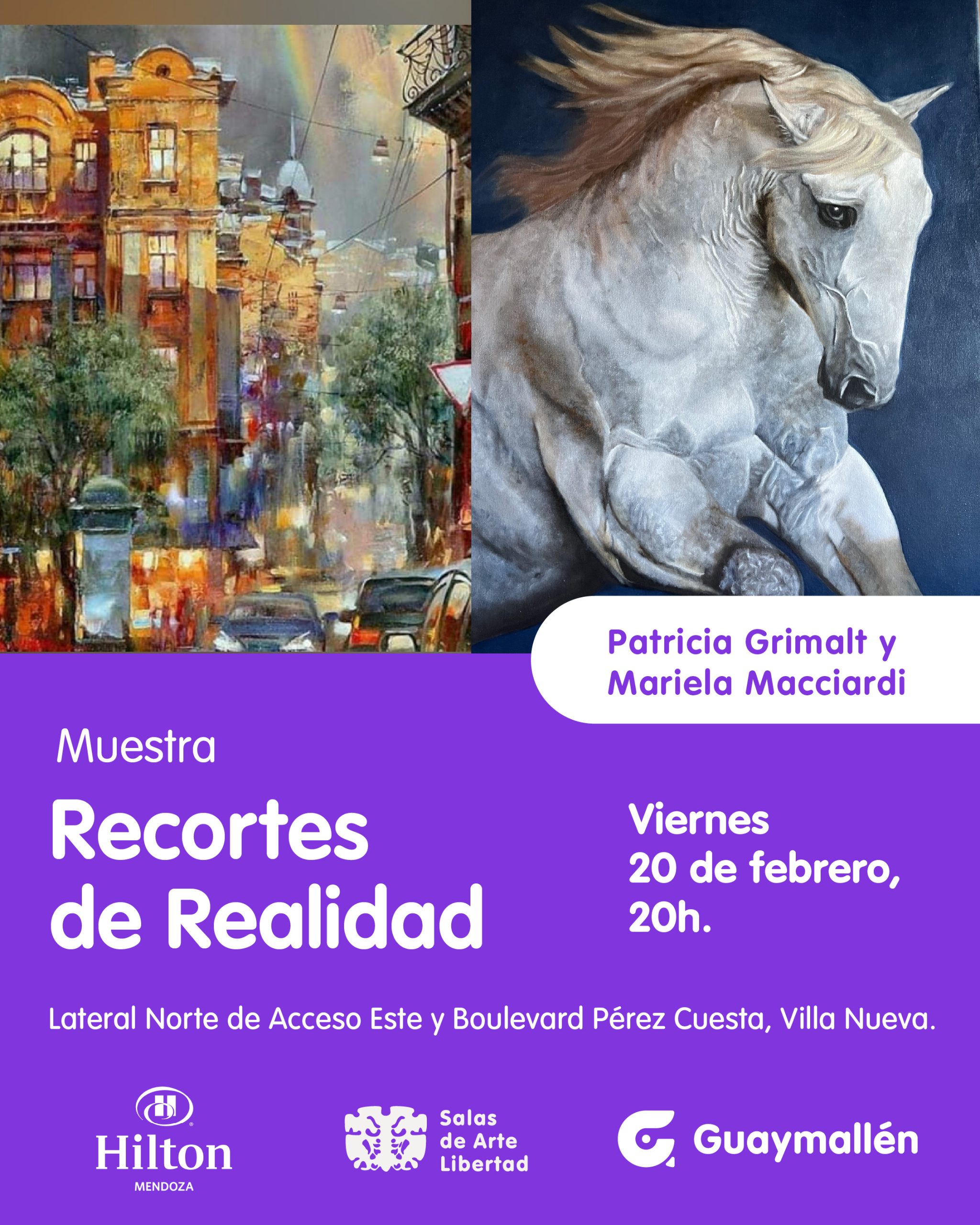 La Municipalidad de Guaymallén invita a vecinos y visitantes a la inauguración de la muestra de pinturas “Recortes de realidad”, de las artistas Patricia Grimalt y Mariela Macciardi. La misma tendrá lugar el viernes 20 de febrero, a las 20h, en el Hotel Hilton Mendoza.