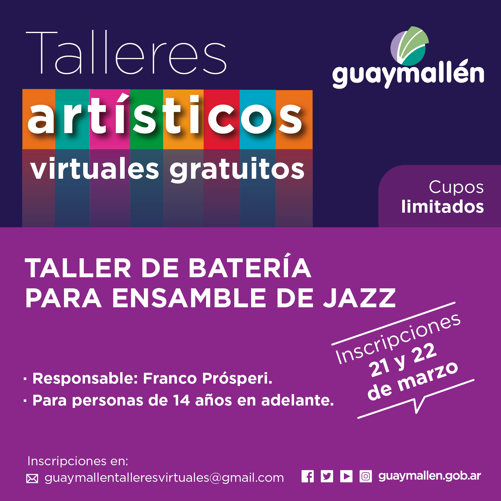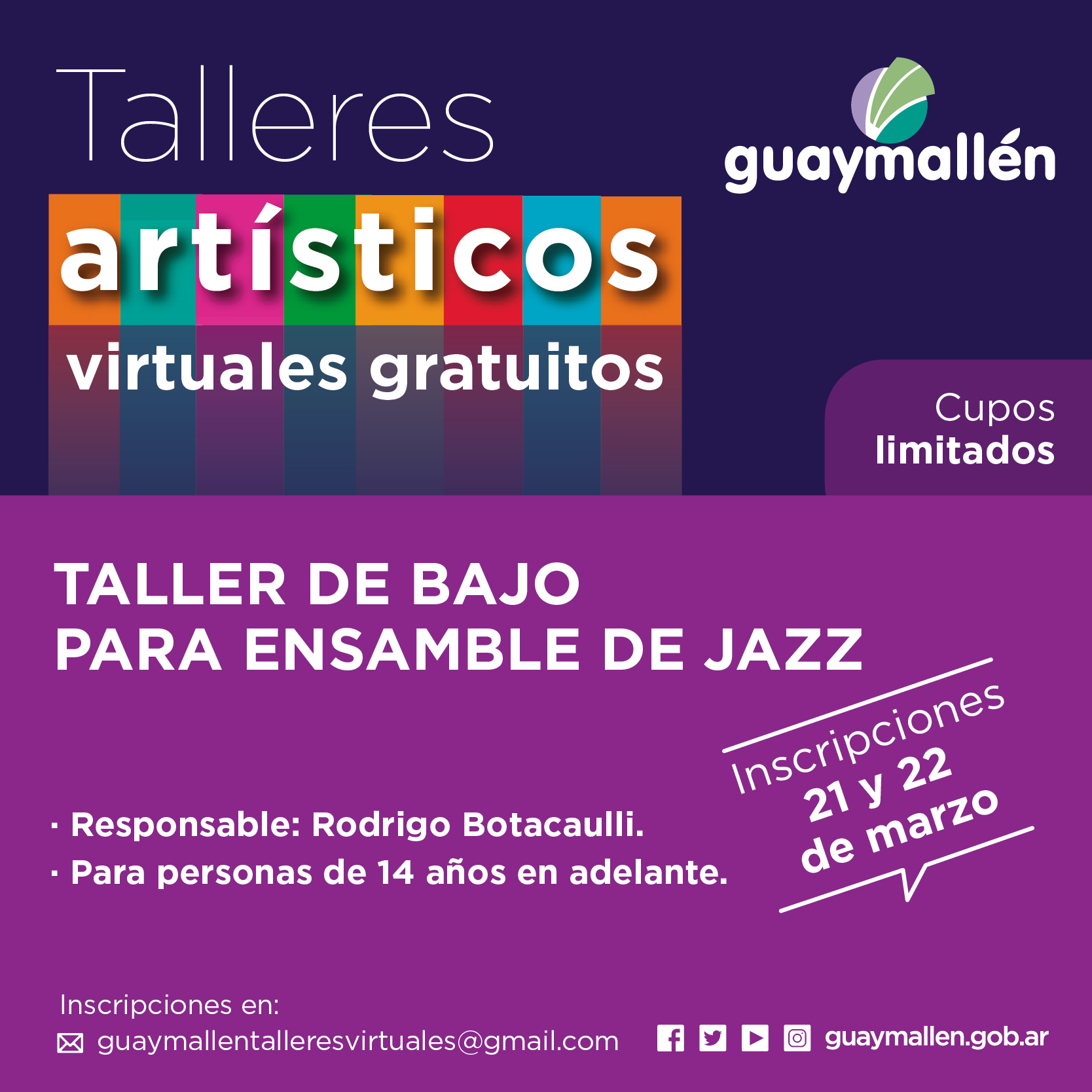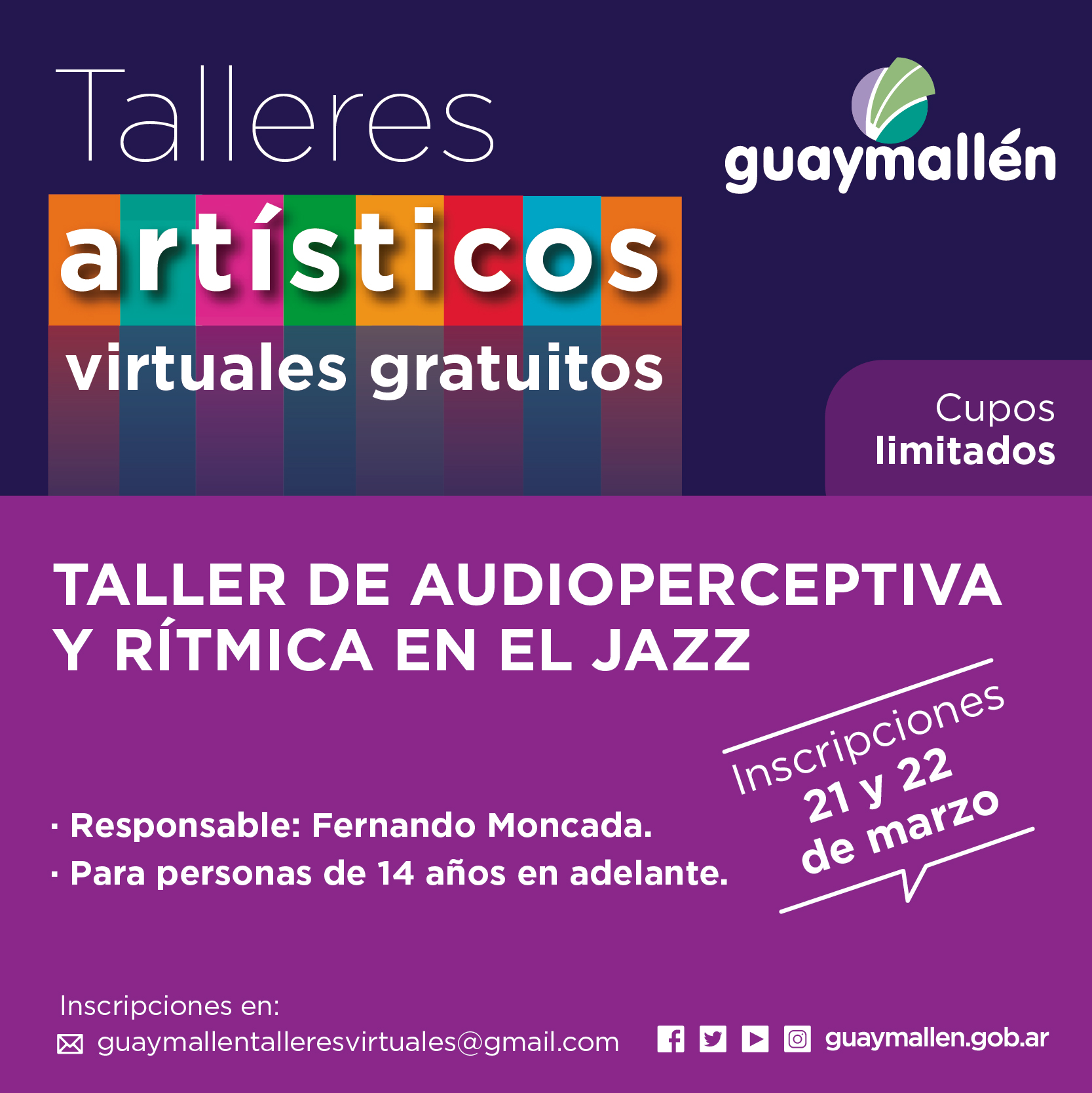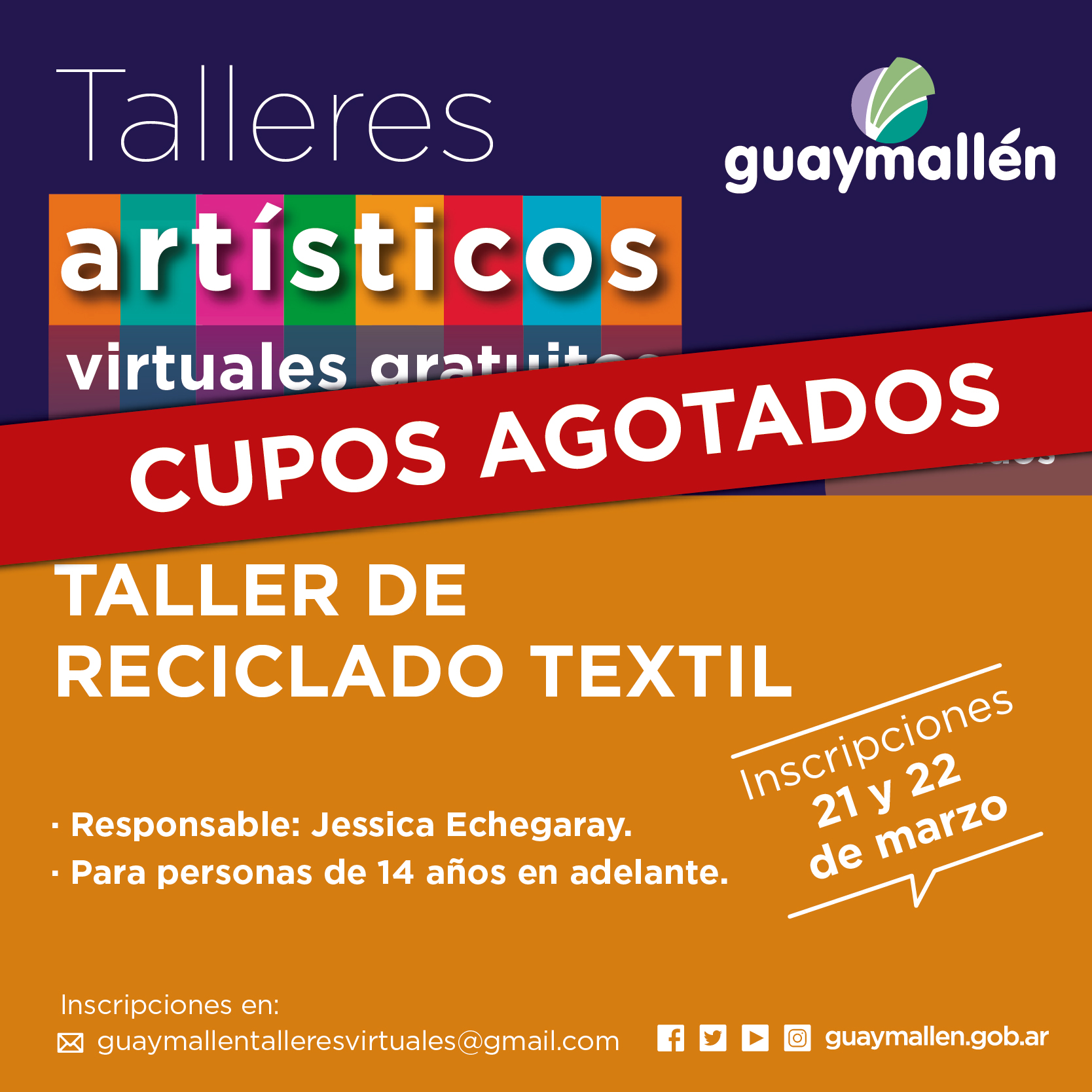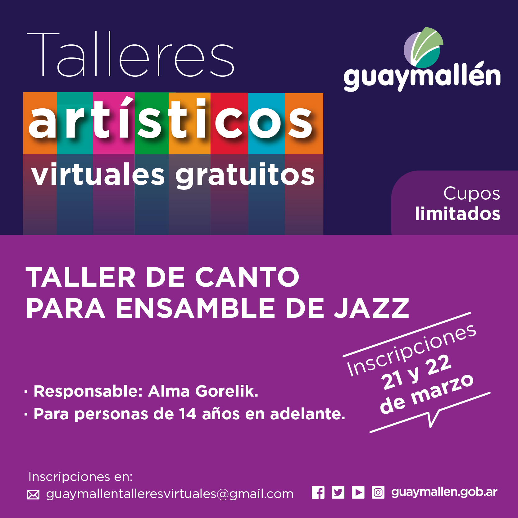 Los interesados podrán inscribirse los días 21 y 22 de marzo, a través del correo: guaymallentalleresvirtuales@gmail.com