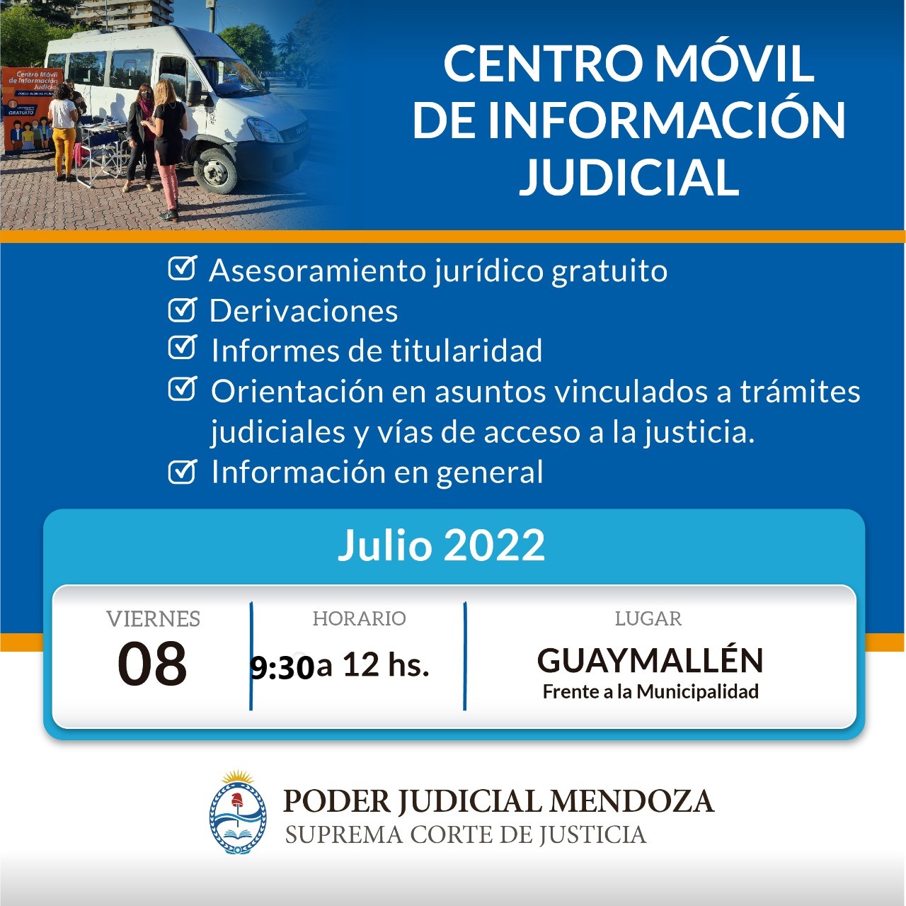 El Centro Móvil de Información Judicial se instalará nuevamente frente a la explanada municipal (Libertad 720, distrito Villa Nueva). Será el próximo viernes 8 de julio, de 9:30 a 12h.