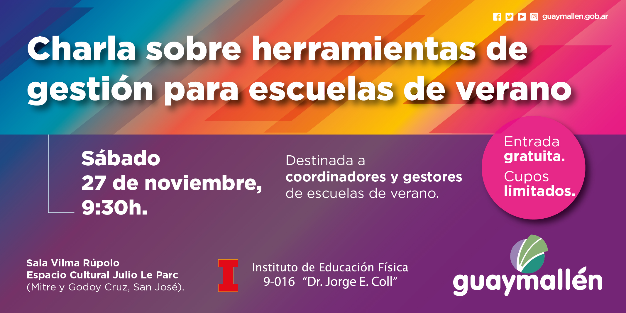 La Municipalidad de Guaymallén y el Instituto de Educación Física Jorge E. Coll (IEF) invitan a coordinadores y gestores de escuelas de verano a participar de un encuentro sobre gestión y organización de estos espacios. Será el sábado 27 de noviembre, a las 9:30h, en la sala Vilma Rúpolo del Espacio Cultural Julio Le Parc (Mitre y Godoy Cruz, San José). La iniciativa es gratuita, con cupos limitados, y requiere previa inscripción a través del link https://ief9-016.edu.ar/registro/.