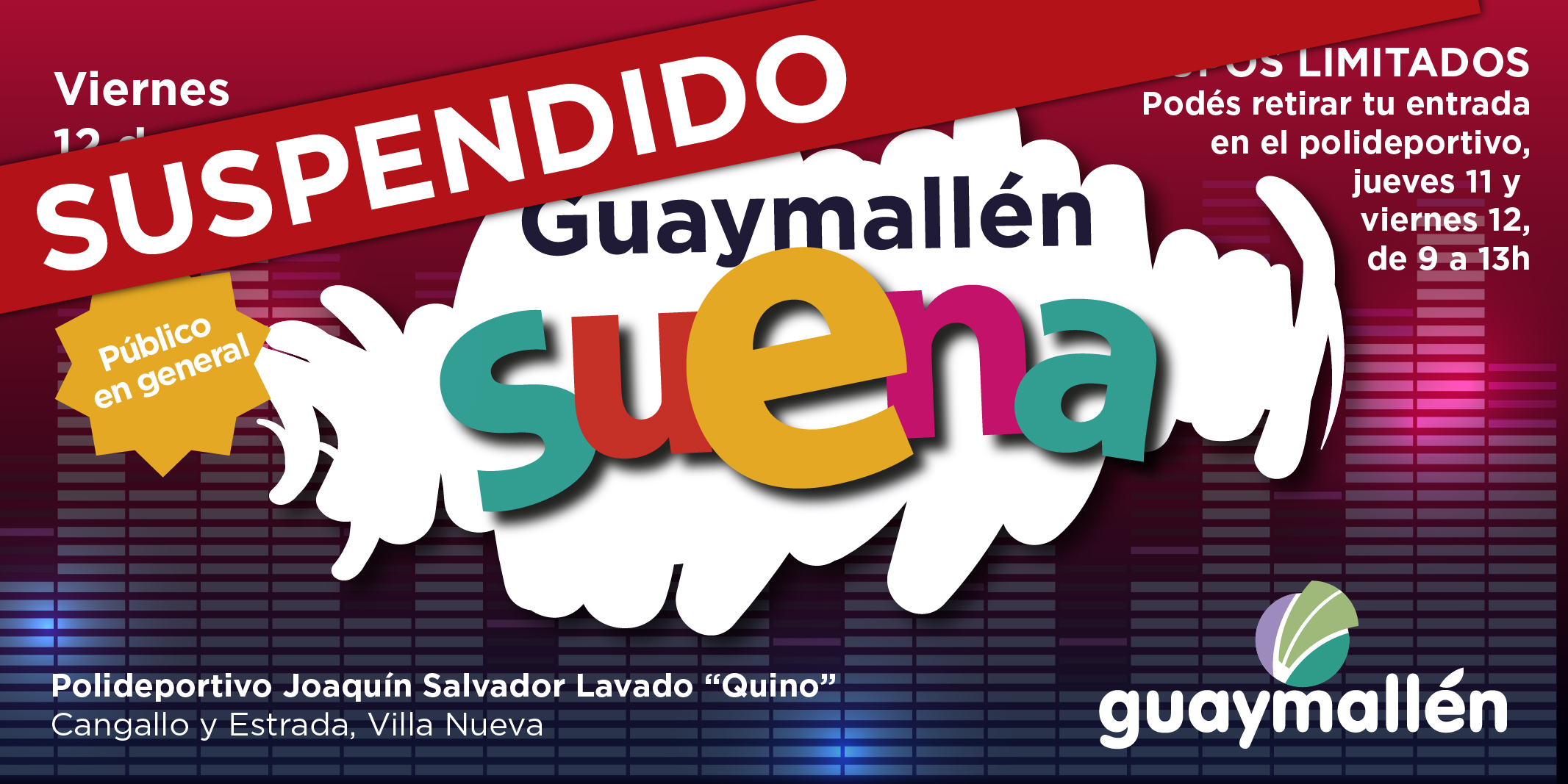 La comuna informa que queda suspendido el primer recital del programa Guaymallén Suena debido al pronóstico meteorológico, que anticipa lluvias para este viernes 12 de febrero. Cuando esté confirmada la fecha de reprogramación, se comunicará a través de las redes sociales del municipio y del sitio web www.guaymallen.gob.ar.