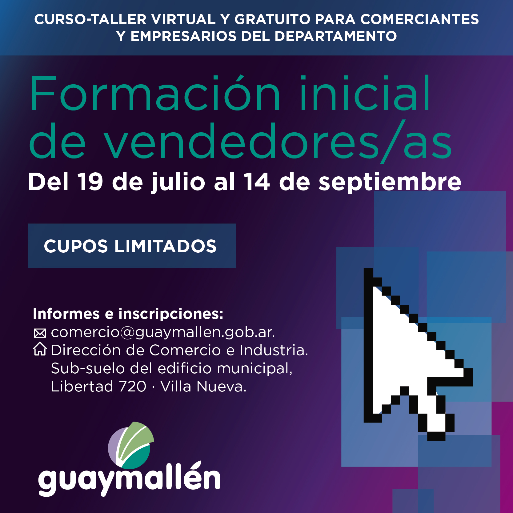 El Municipio de Guaymallén recuerda a los comerciantes y empresarios del departamento que, con el auspicio de la Secretaría de Extensión y Vinculación de la Universidad Nacional de Cuyo, la UCIM ha organizado un nuevo curso-taller de “Formación inicial de vendedores/as”, con cupos limitados.
