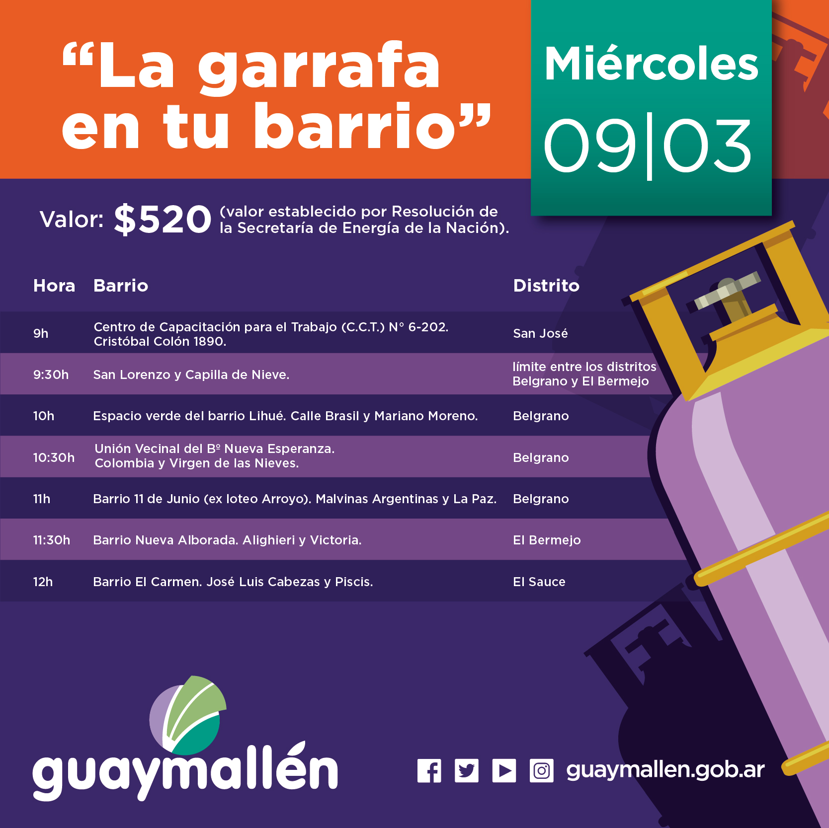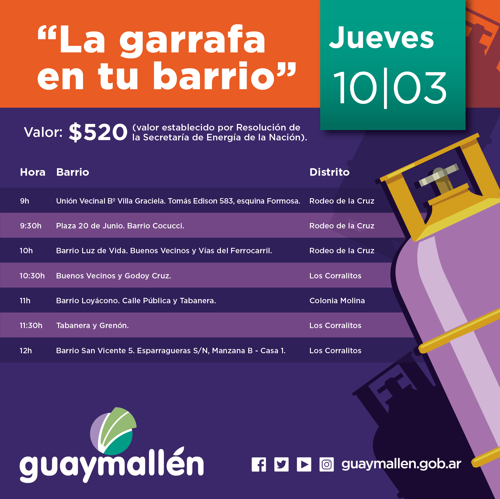 La próxima semana, las familias del departamento podrán realizar la compra directa de gas envasado en diferentes locaciones. Se trata de garrafas de 10 kg. al precio oficial de $520 (valor establecido por Resolución de la Secretaría de Energía de la Nación).