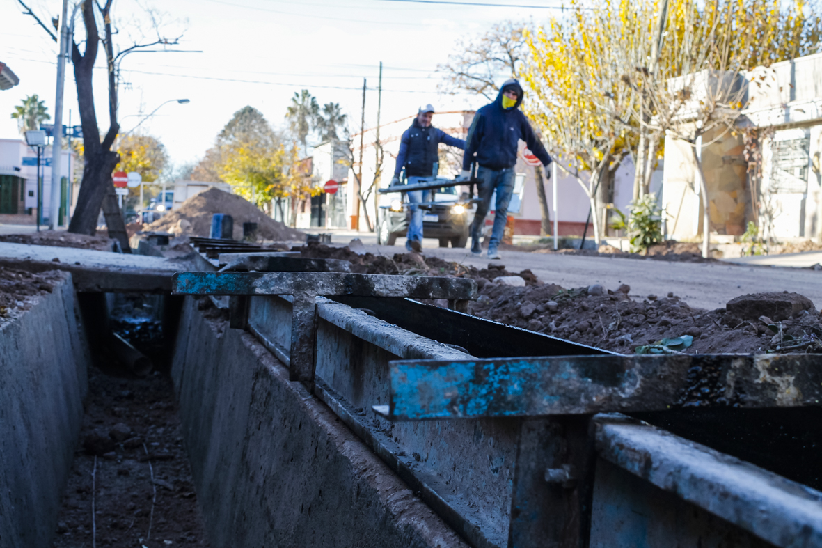Los drenajes nuevos de calle España se construyen en el tramo de 200 metros comprendido entre Avellaneda y Victoria. Allí serán impermeabilizados en hormigón, cordones, cunetas y banquinas en una obra que prevé también nuevos puentes vehiculares para los frentistas.