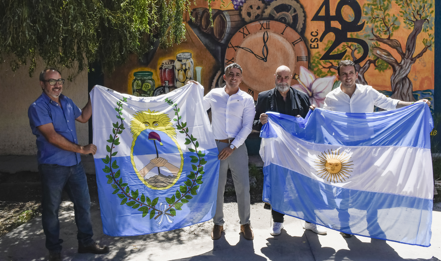 El intendente guaymallino regaló dos banderas a la escuela técnica del distrito Los Corralitos, una provincial y la otra nacional.