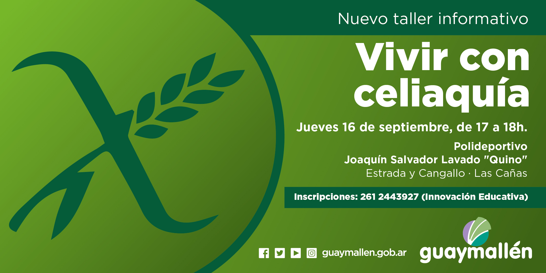 Este jueves 16 de septiembre, la Municipalidad invita a participar del taller informativo sobre celiaquía, una patología multisistémica que provoca una reacción inmunológica ante la ingesta de gluten. La jornada se realizará de 17 a 18 h, en el Polideportivo Joaquín Salvador Lavado «Quino» (Estrada y Cangallo). Los cupos son limitados y quienes deseen formar parte deben inscribirse previamente a través del teléfono 261 2443927 (Innovación Educativa). A través de esa misma línea, podrán realizar consultas o solicitar más información sobre la iniciativa.