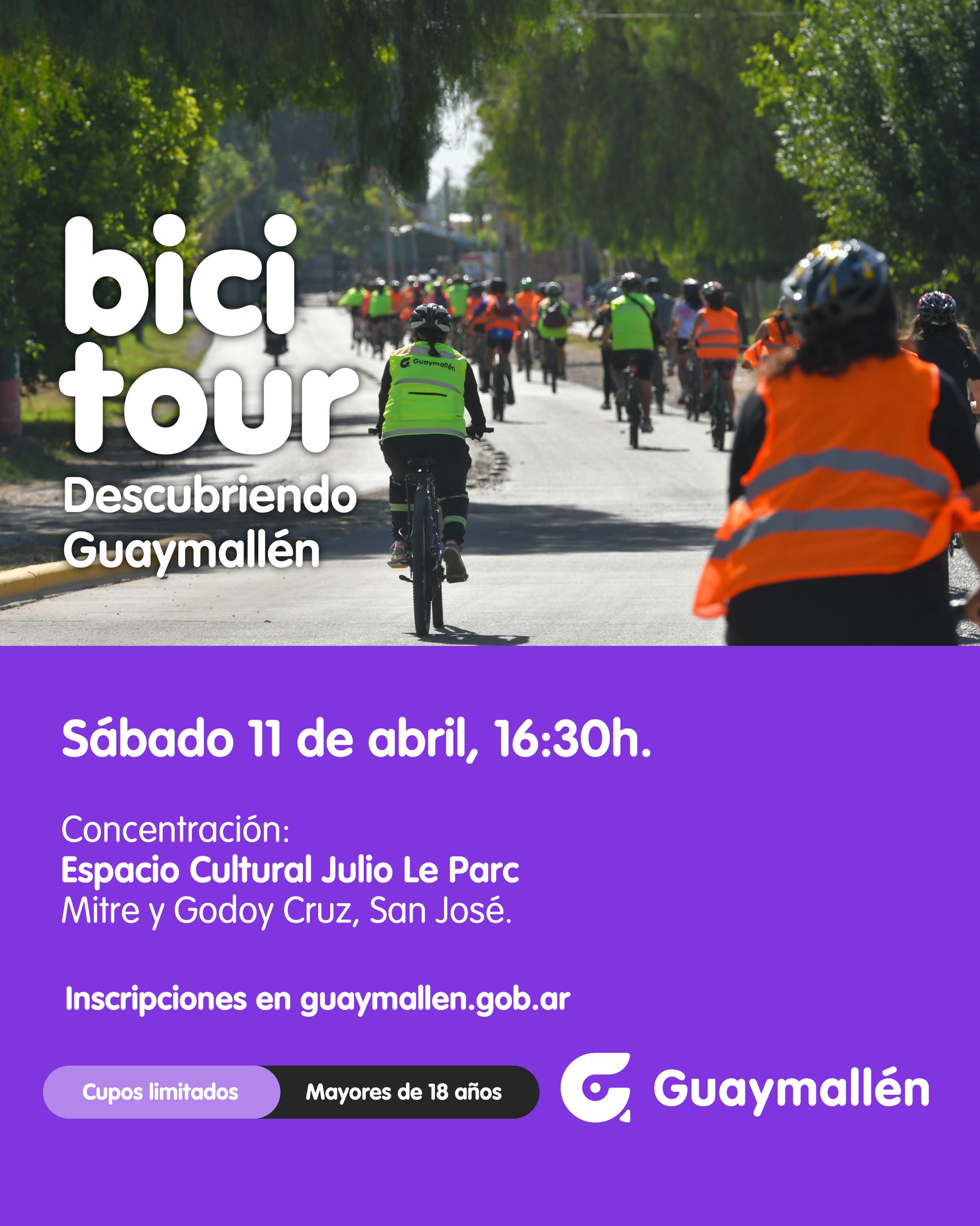 El próximo sábado 11 de abril se llevará a cabo la primera edición del año del “Bicitour, descubriendo Guaymallén”, una propuesta pensada para disfrutar y redescubrir la historia y los espacios emblemáticos que forman parte del patrimonio del departamento.