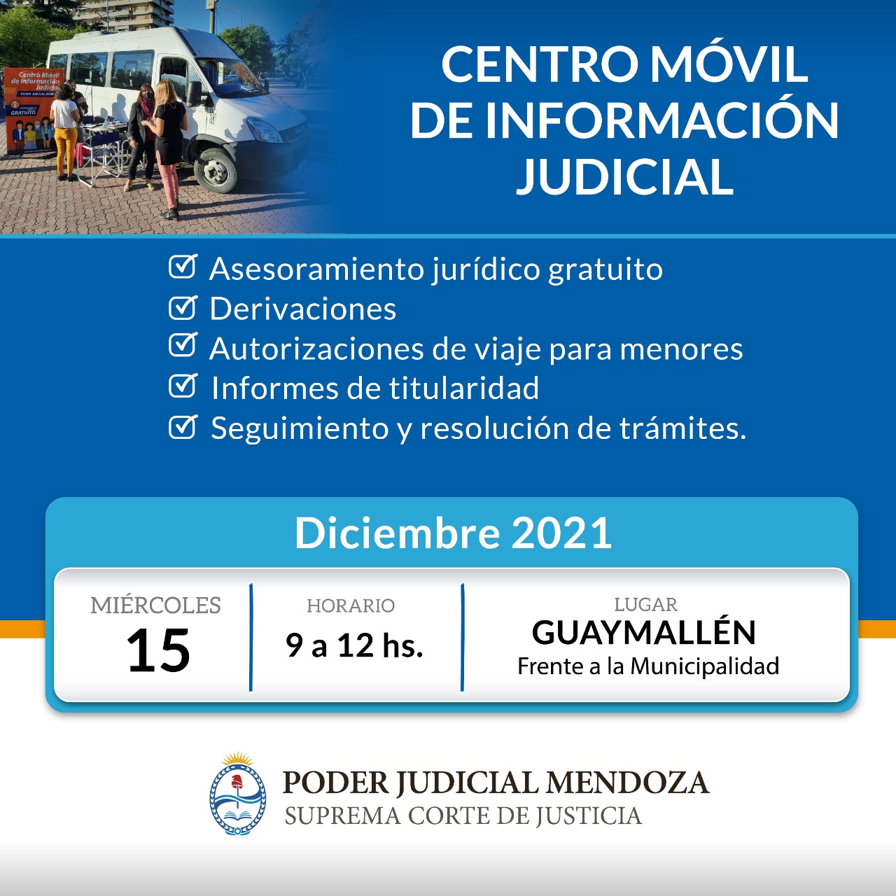 El Centro Móvil de Información Judicial atenderá al público el próximo miércoles 15 de noviembre, de 9 a 12h, frente a la explanada municipal (Libertad 720, distrito Villa Nueva).